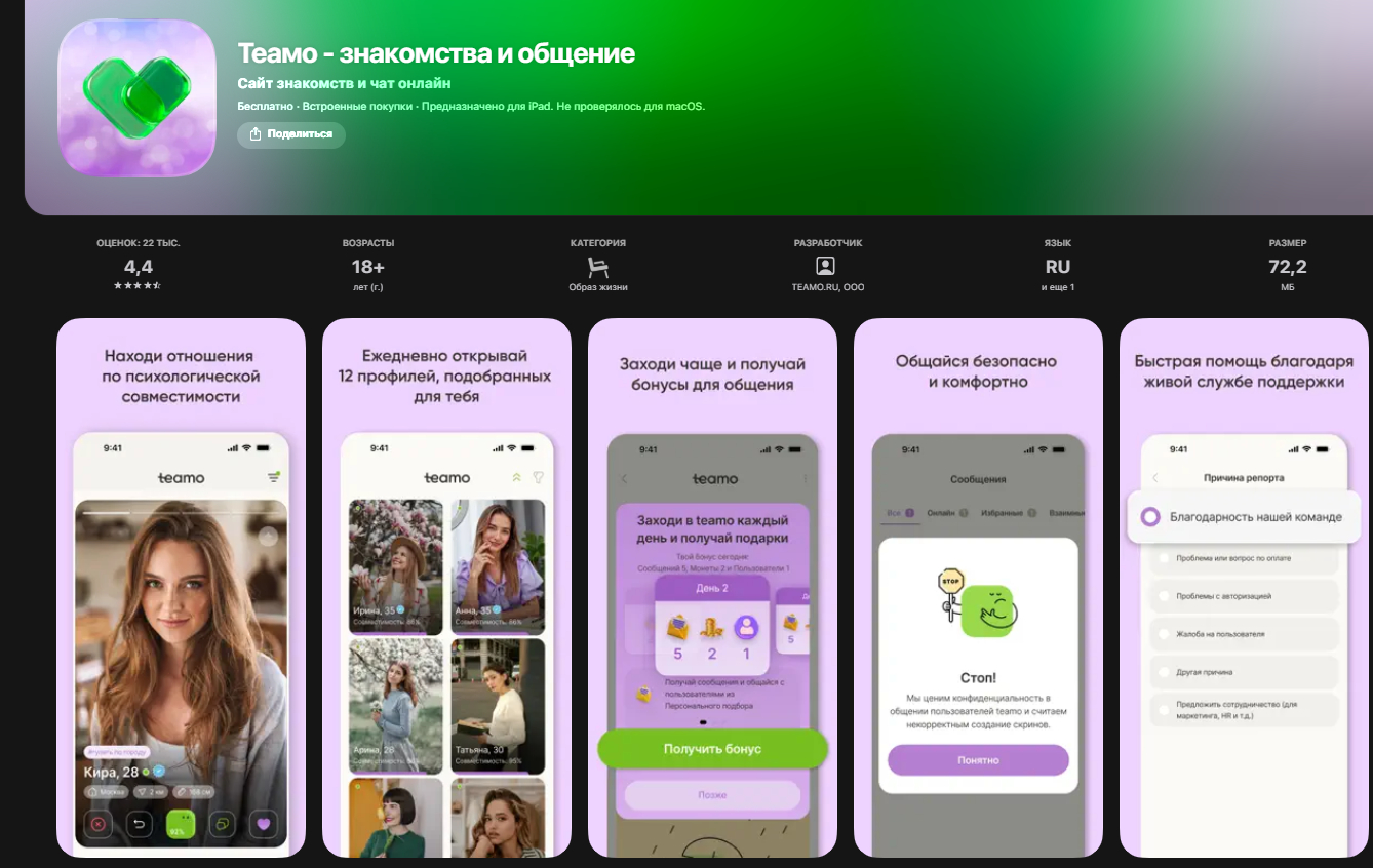 - ❤️ Для серьёзных отношений: Teamo — больше пользователей с целью «пара, а не переписка ради переписки».