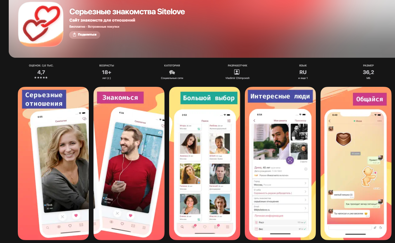 - Возможности: переписка, подбор по параметрам, поиск по городу.