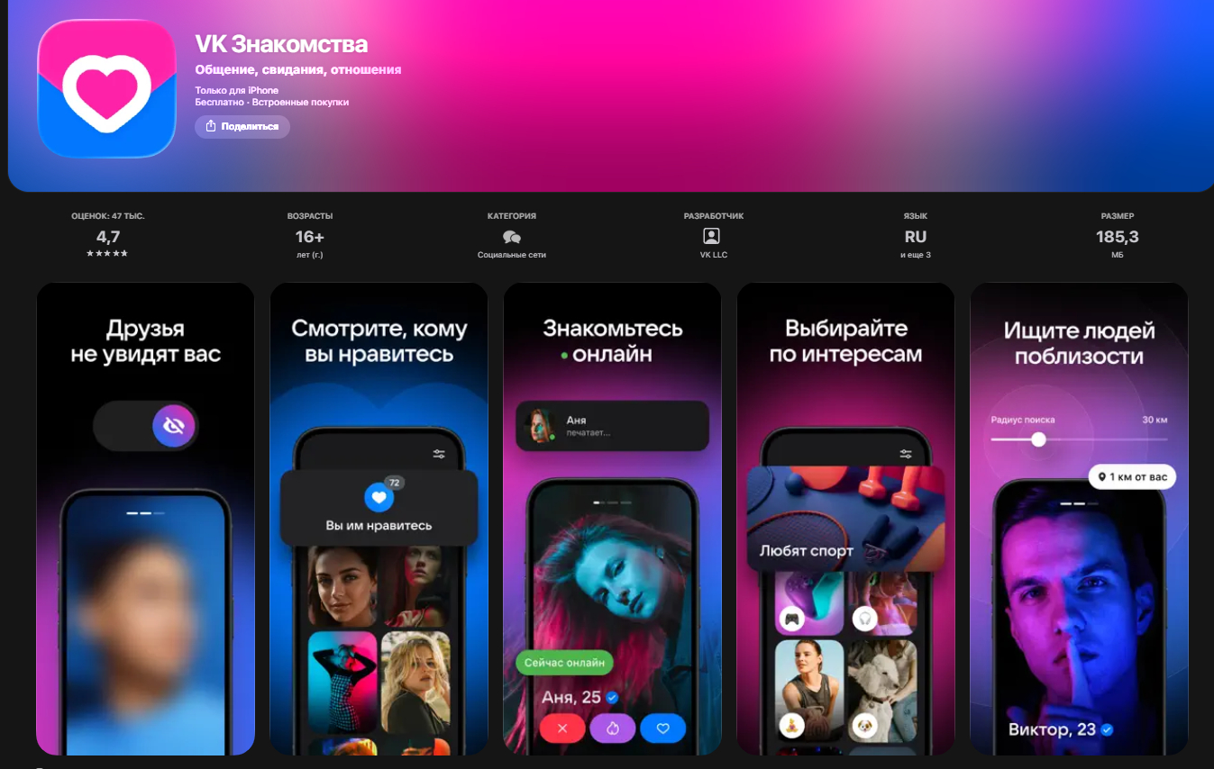 - Преимущества: Привычный интерфейс; удобно знакомиться “на ходу”; много сценариев от общения до отношений.