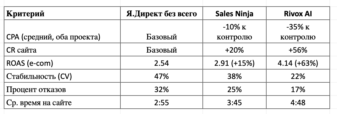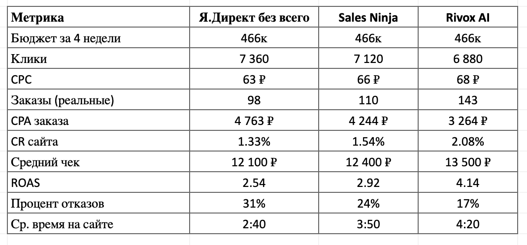 «Главный вывод: предиктивная оптимизация реально работает. Оба продукта — и Rivox AI, и Sales Ninja — показали результат лучше, чем стандартные автостратегии Директа.