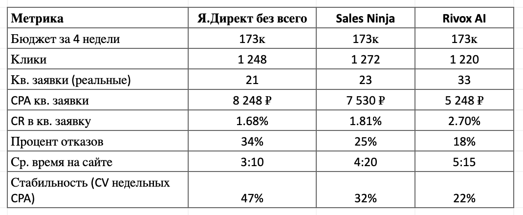 Rivox AI при тех же условиях показал снижение CPA на 36% к контролю и на 30% к Sales Ninja. Количество квалифицированных заявок выросло с 21 до 33 за 4 недели — на 57%. При этом стабильность (CV) составила 22% — заявки приходили равномерно, без «пустых» дней и «завалов».