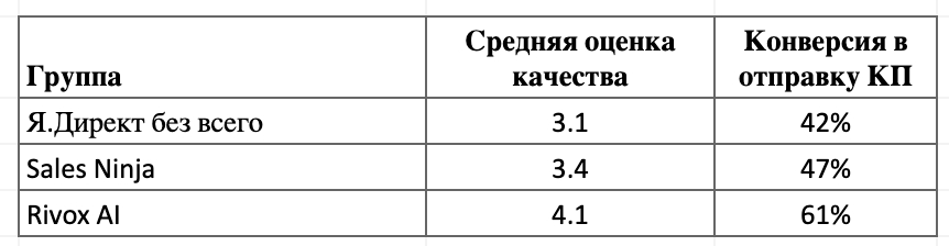 Разница между Rivox и контролем — ощутимая. Разница между Sales Ninja и контролем — есть, но умеренная. А вот разрыв между Rivox и Sales Ninja по конверсии в КП (61% vs 47%) оказался для нас неожиданным: Rivox не просто приводил больше заявок — он приводил более качественных потенциальных клиентов.