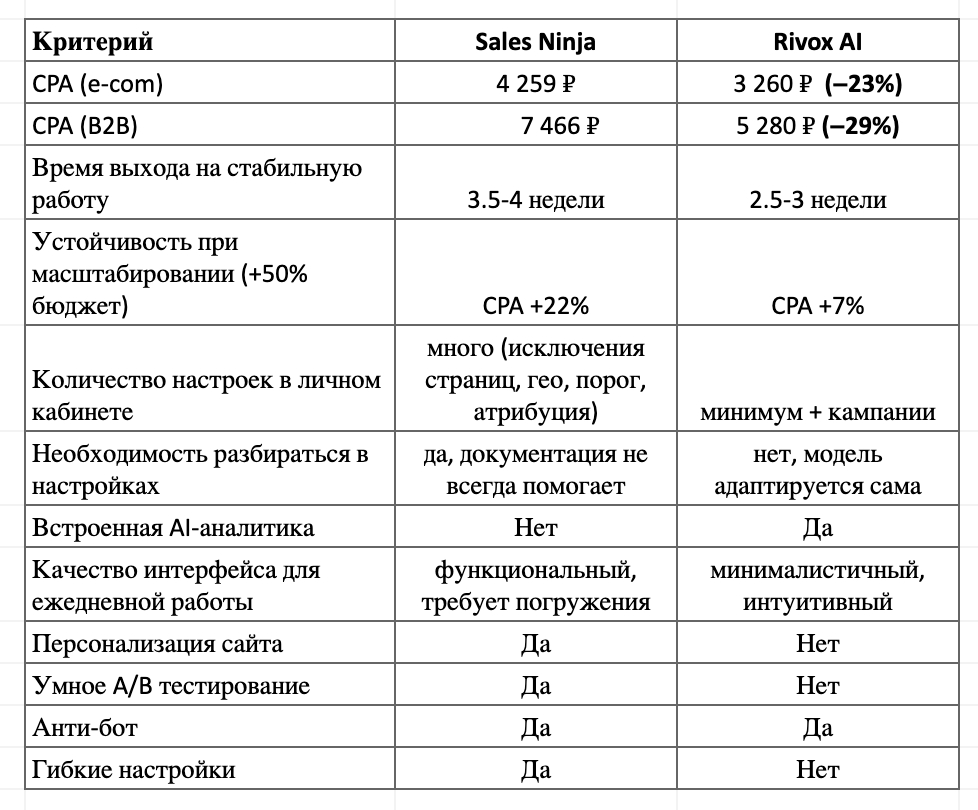 В нашем тесте на двух проектах (e-commerce и B2B) Rivox AI показал снижение CPA на 32-37% к контролю, Sales Ninja — на 10-11%. При масштабировании бюджета Rivox AI сохранил эффективность (CPA +7%), Sales Ninja — нет (CPA +22%). По удобству работы Rivox AI также выигрывает за счёт автоматической адаптации модели. Если задача — предиктивная оптимизация рекламы, Rivox AI дал лучший результат. Если нужна ещё и персонализация контента на сайте — стоит рассмотреть Sales Ninja.