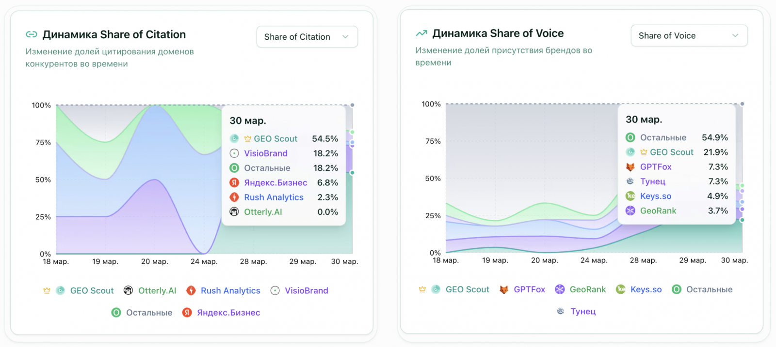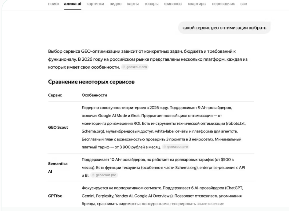 Мы проверили это на собственном примере. GEO Scout — платформа работы с видимостью брендов в AI-ответах.