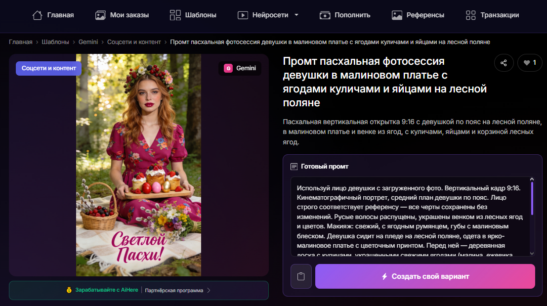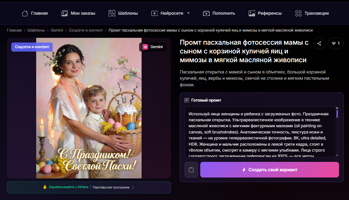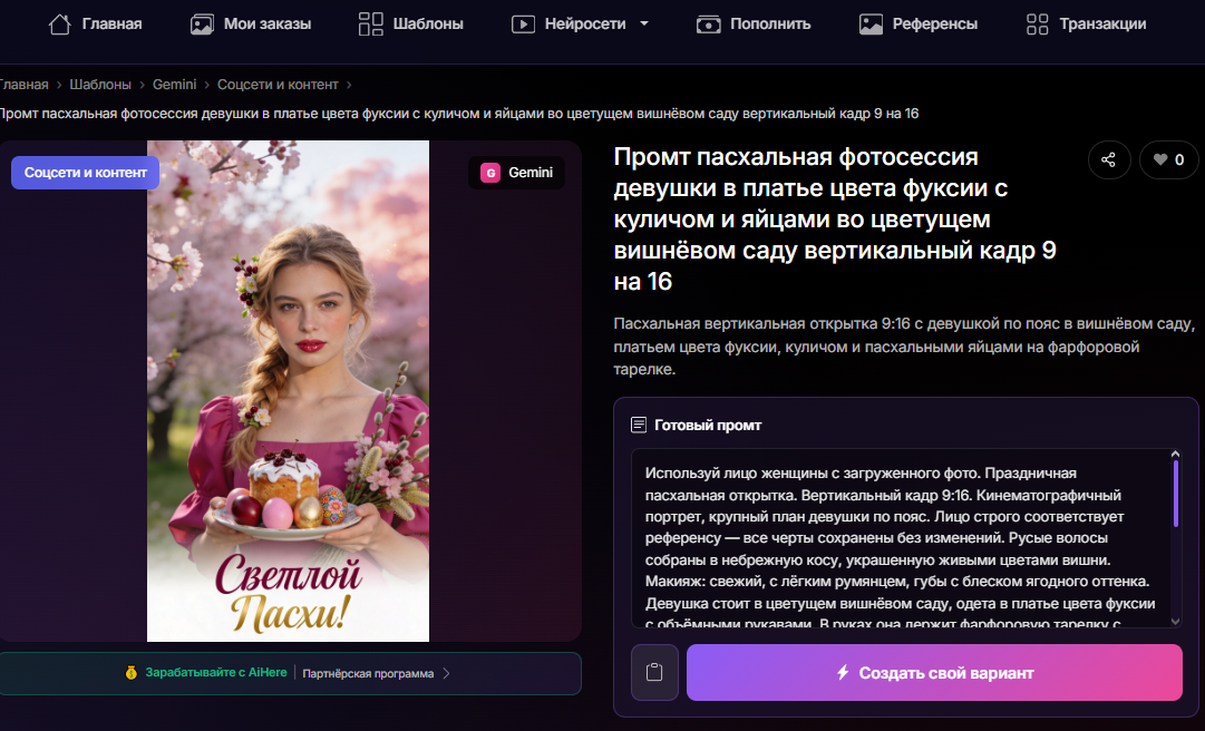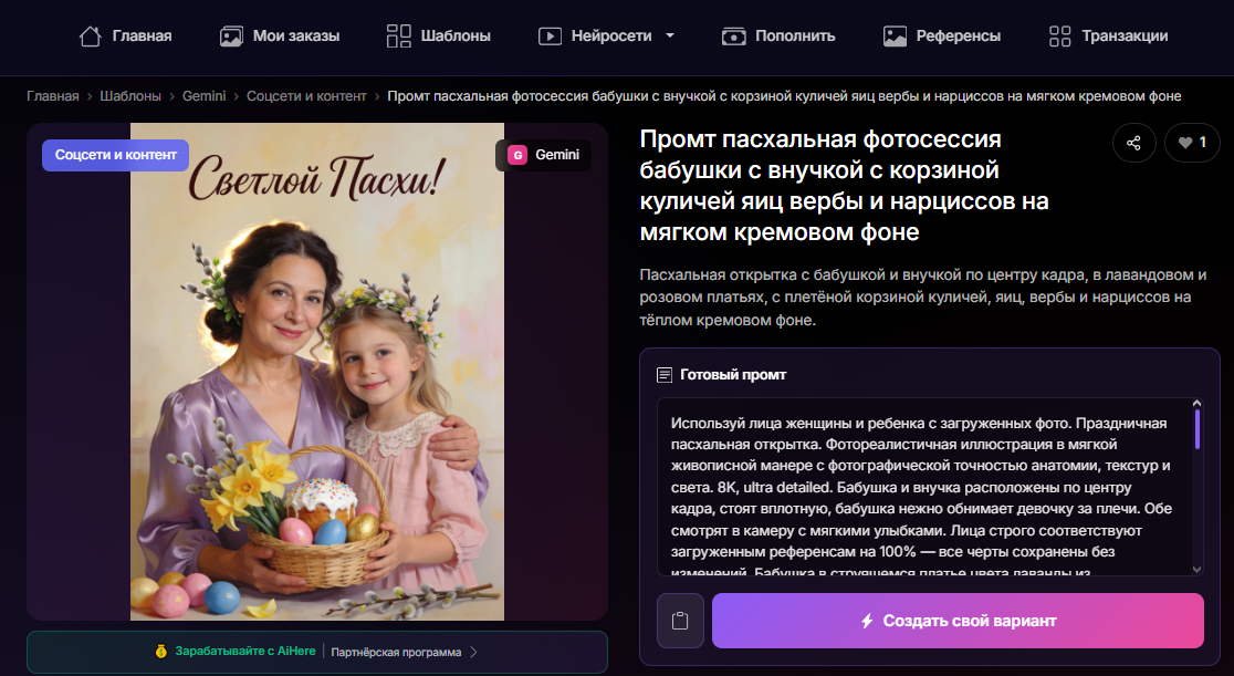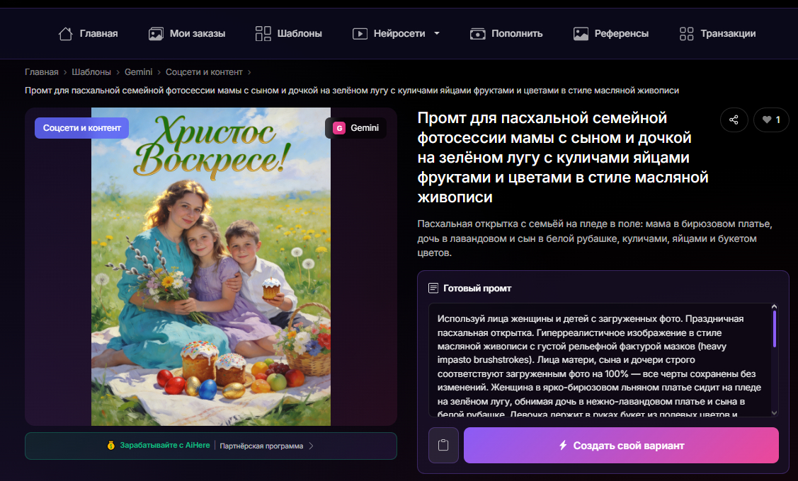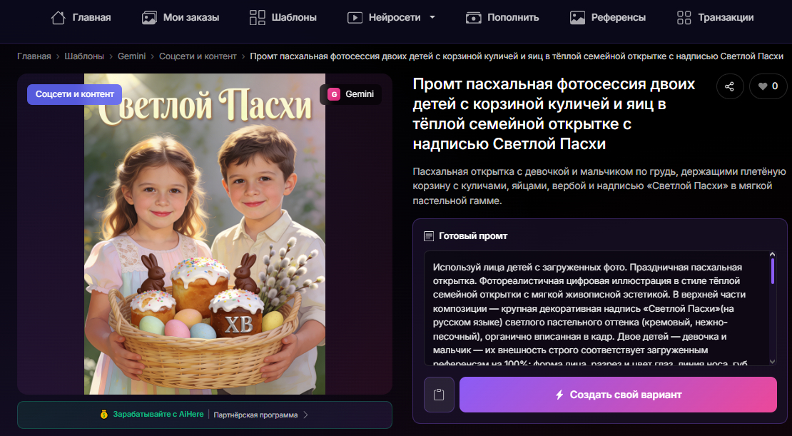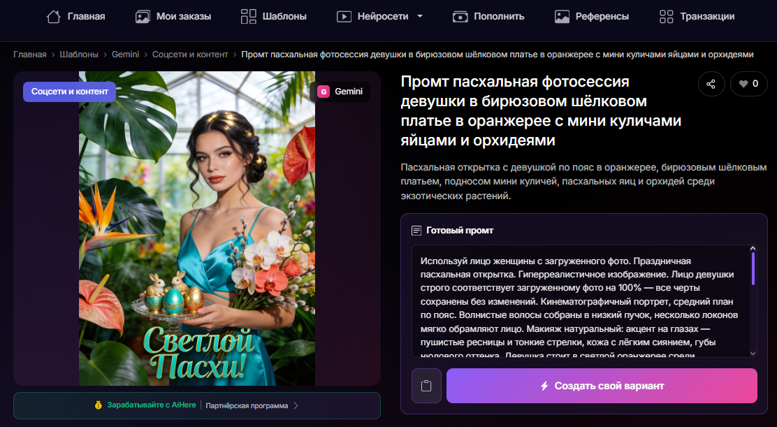 Чтобы не тратить время на эксперименты, удобно использовать готовые решения. На сайте aihere есть специальный раздел с промтами, где собраны варианты под разные задачи, включая праздничные открытки.