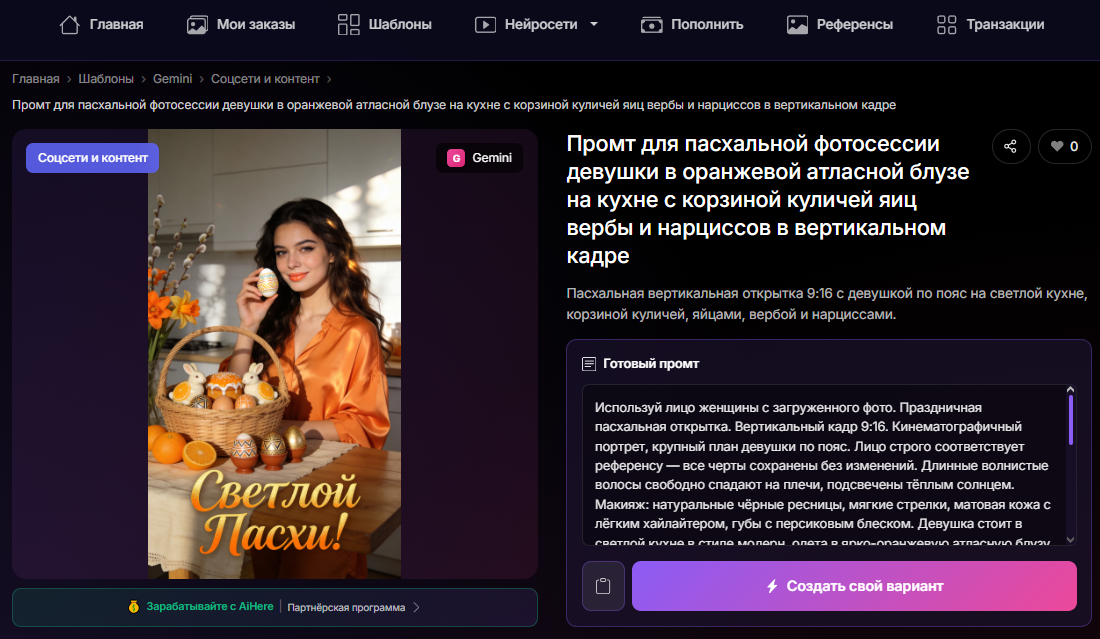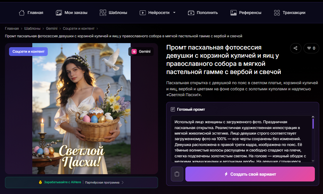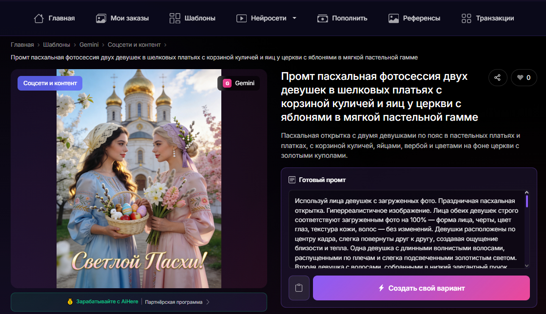 Чтобы добиться максимального качества, многие пользователи используют готовые промты. На сайте aihere представлен большой выбор таких решений, включая варианты для пасхальных открыток. Это упрощает работу с нейросетью и помогает сразу получать красивые и проработанные изображения без лишних экспериментов.