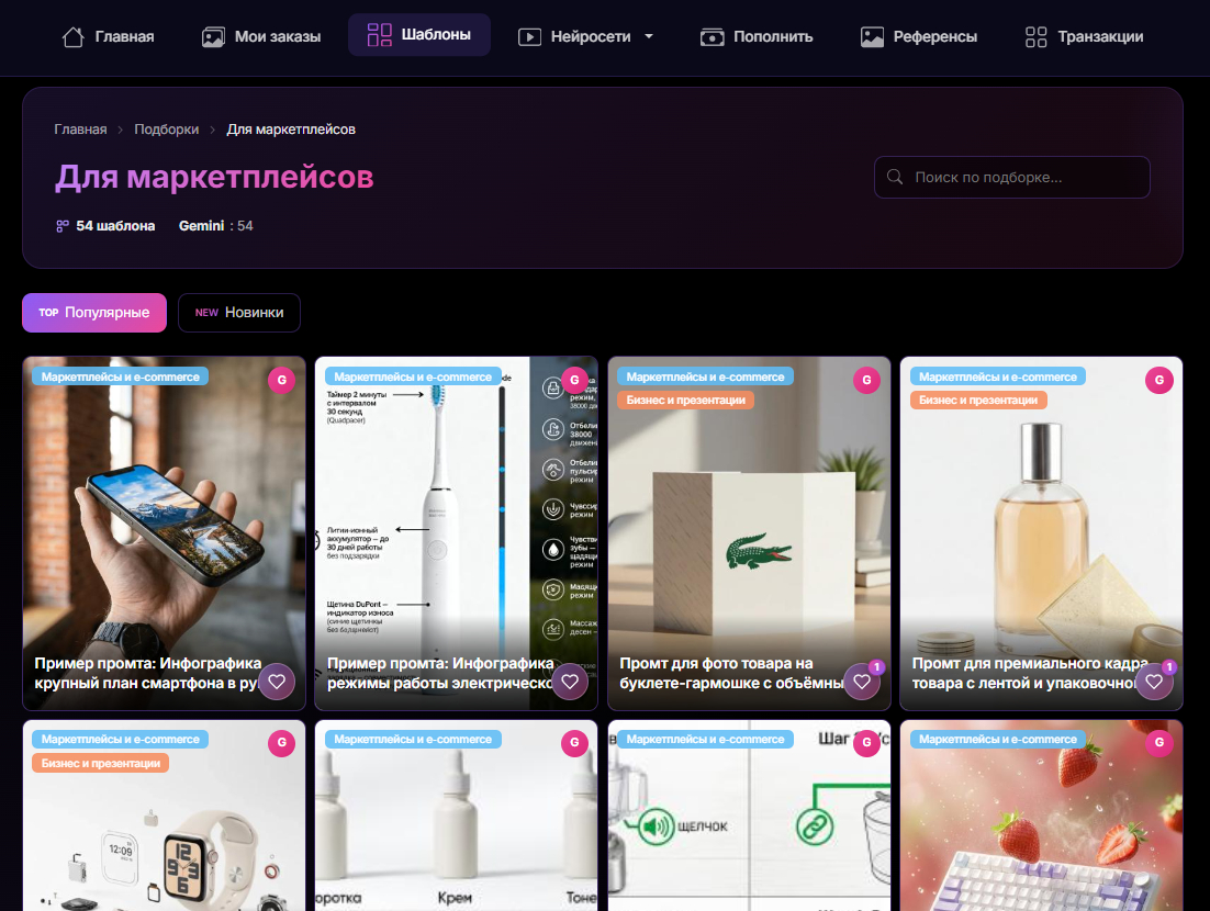 Гораздо эффективнее использовать сервисы, где уже есть готовые шаблоны, адаптированные под требования маркетплейсов. Такие промты учитывают особенности подачи товара, композицию и стиль изображений. Например, в aihere уже собрана большая база решений, которые можно применять сразу, без долгой подготовки. Это особенно удобно, если вы работаете с большим ассортиментом.