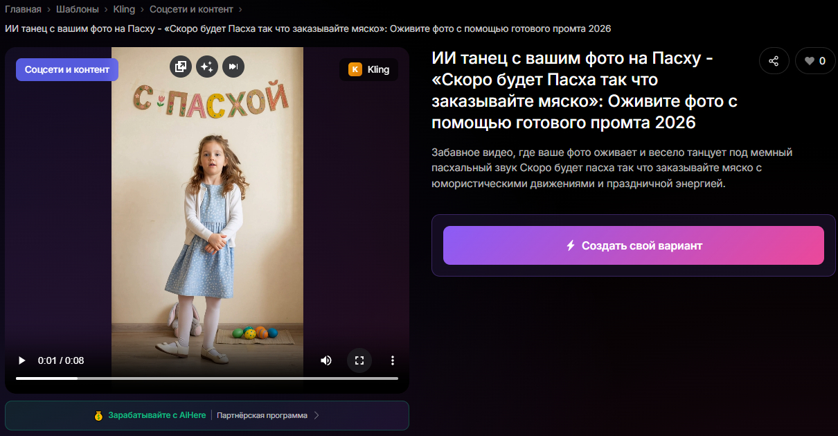Далее перейдите на готовый промт👈 под "Скоро будет Пасха так что заказывайте мяско". Это значительно упрощает процесс, так как вам не нужно придумывать текст самостоятельно. Возьмите шаблон с танцем и переходите к следующему этапу. Готовые промты на aihere уже оптимизированы, поэтому дают более качественный результат.
