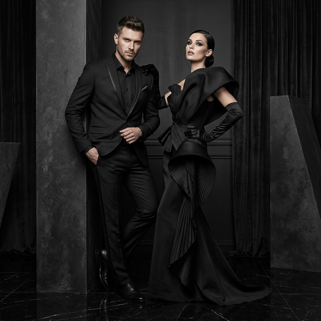 Используйте загруженные эталонные фотографии женщины и мужчины, сохранив их реальные черты лица, цвет волос, тон кожи, пропорции тела и химию между парой. Создайте смелую студийную фотосессию пары в стиле высокой моды, в роскошном черном редакционном стиле. Он одет в идеально сшитый черный костюм с тонкими атласными деталями, она — в скульптурное черное платье с эффектным силуэтом и длинными перчатками. Глубокое глянцевое студийное освещение, сильный контраст, премиальный журнальный стиль, выразительная поза, асимметричные позы, многослойная композиция, отражающий пол, атмосфера дорогой модной кампании, четкие текстуры, кинематографические тени, уверенные выражения лиц, отсутствие минимализма, плоского фона, статичных поз — все это создаст эффект редакционной фотосессии уровня Vogue.