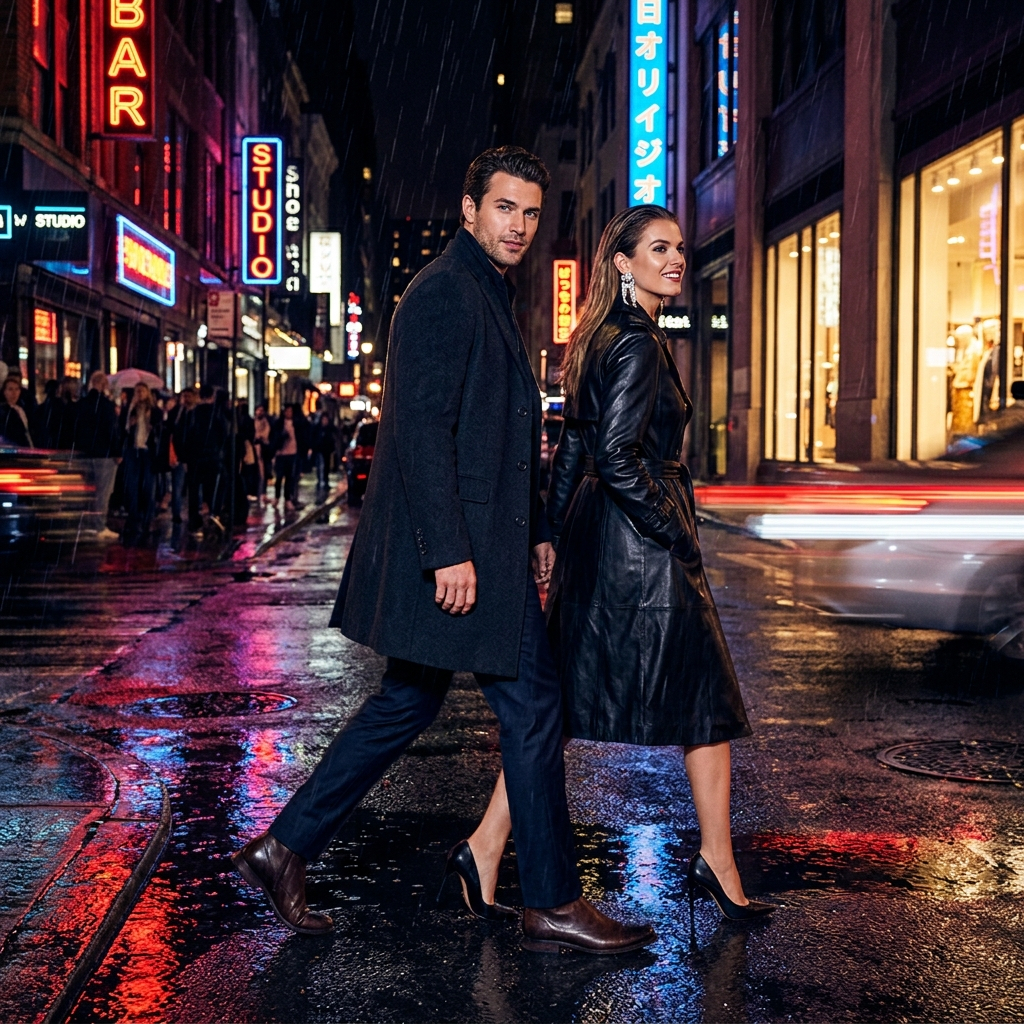 Используйте загруженные эталонные фотографии пары и реалистично сохраните их мимику. Создайте роскошную ночную городскую фотосессию стильной пары, идущей по мокрой городской улице после дождя. Неоновые отражения на асфальте, огни витрин, кинематографическое размытие дорожного движения, сильная вспышка в сочетании с окружающим городским светом. Он одет в темное шерстяное пальто и брюки премиум-класса, она — в кожаный тренч, туфли на каблуках и эффектные серьги. Динамичное движение, уверенная поза при ходьбе, один человек смотрит в камеру, другой — искоса, многослойная городская глубина, богатые текстуры, сексуальная, но элегантная энергия, глянцевое качество модной рекламной кампании, не минималистичные, не обычные туристические фотографии — сделайте их насыщенными и похожими на редакционные снимки.