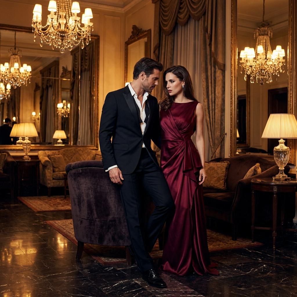 Используйте загруженные эталонные фотографии мужчины и женщины, сохранив узнаваемость и элегантность их лиц. Создайте фотосессию для пары в роскошном винтажном отеле с золотистым теплым светом, мраморным полом, высокими зеркалами, бархатной мебелью и атмосферой старой аристократии. Он одет в черный смокинг с расстегнутым воротником, она — в темно-бордовое атласное платье с эффектной драпировкой. Интимный, но изысканный язык тела, кинематографическая романтика, тонкое напряжение между ними, многослойная роскошная композиция, насыщенные тени, отражающие детали, ретушь журнального уровня, премиальная фэшн-фотография, чувственность без вульгарности, отсутствие пустого пространства, отсутствие скучного минималистичного стиля.
