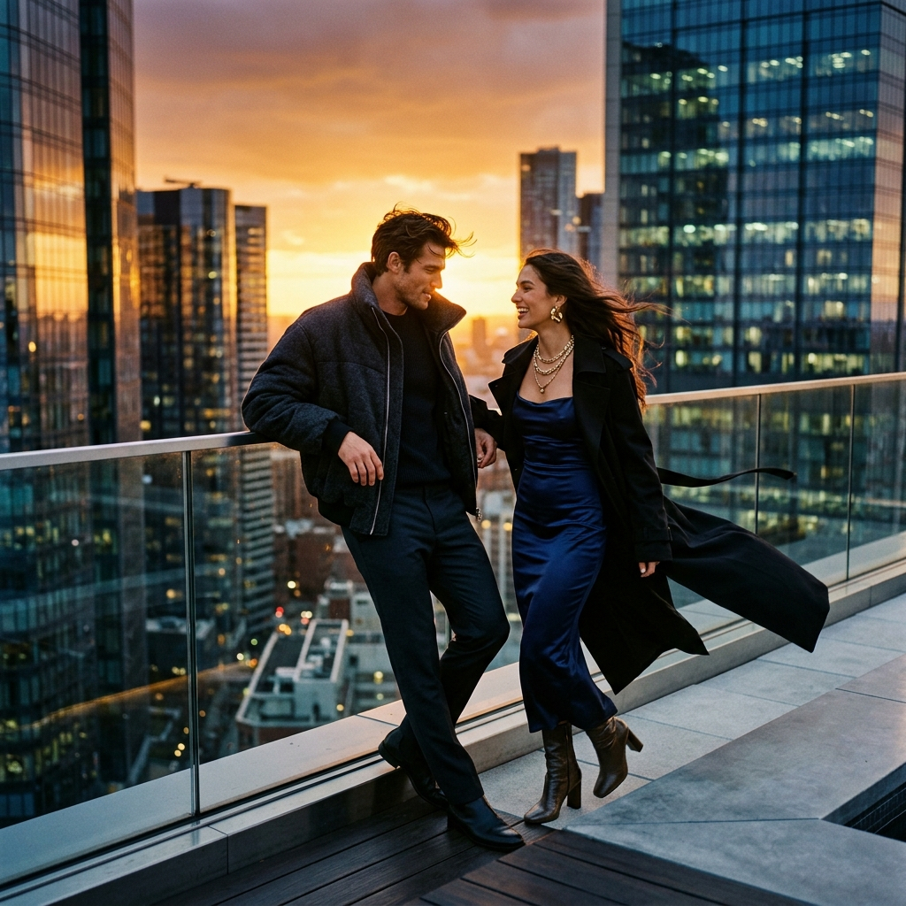 Используйте загруженные эталонные фотографии, сохраняя при этом подлинную индивидуальность обоих людей. Создайте высококлассную фотосессию для пары на крыше на закате над современным городским пейзажем. Золотистый свет в сочетании с холодными отражениями стекла, ветер в волосах, эффектное движение одежды, дорогая редакционная атмосфера. Он одет в объемный дизайнерский пиджак с открытым воротником и темные брюки, она — в облегающее эффектное платье с броскими украшениями и длинным пальто, развевающимся на ветру. Выразительные позы, четкое освещение линии подбородка, кинематографическая перспектива, качество модной рекламы, многослойный фон городского пейзажа, богатый цветовой контраст, эмоциональное напряжение, отсутствие простых стоячих поз, отсутствие минимализма — все это делает фотосессию визуально дорогой и живой.