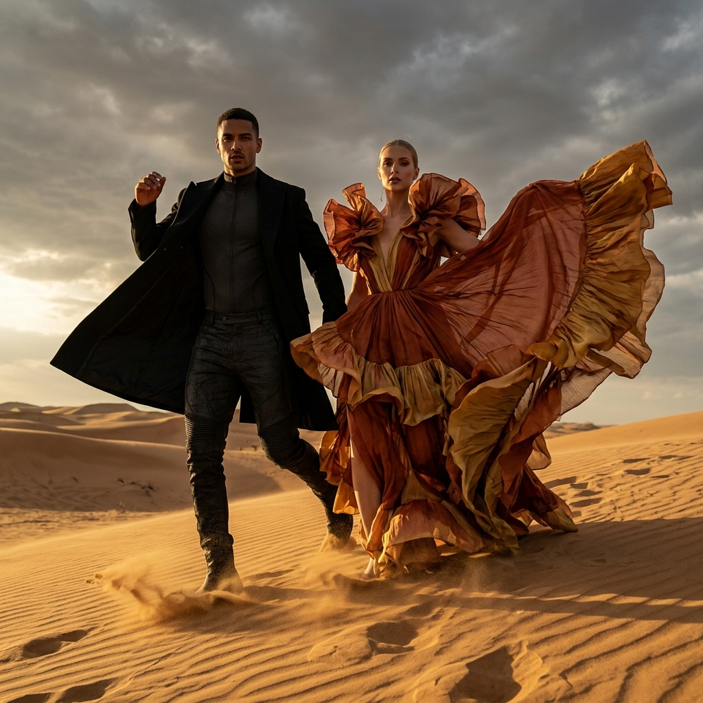 Используйте загруженные эталонные изображения пары, сохранив их реальные черты лица и естественные пропорции. Создайте эффектную фотосессию в стиле высокой моды на фоне пустынного пейзажа с сильным ветром, развевающимися тканями, скульптурным стилем и золотистым светом позднего вечера. Он одет в облегающий монохромный образ с длинным пальто, она — в струящееся платье от кутюр с преувеличенной формой и текстурой. Модные позы, выразительные силуэты, движение, пыль в воздухе, кинематографическая глубина, смелая редакционная композиция, высококлассная рекламная кампания, богатый тональный контраст, детальная текстура ткани, отсутствие однотонного фона, отсутствие статичных поз пары — все это создает эффект обложки мирового модного журнала.