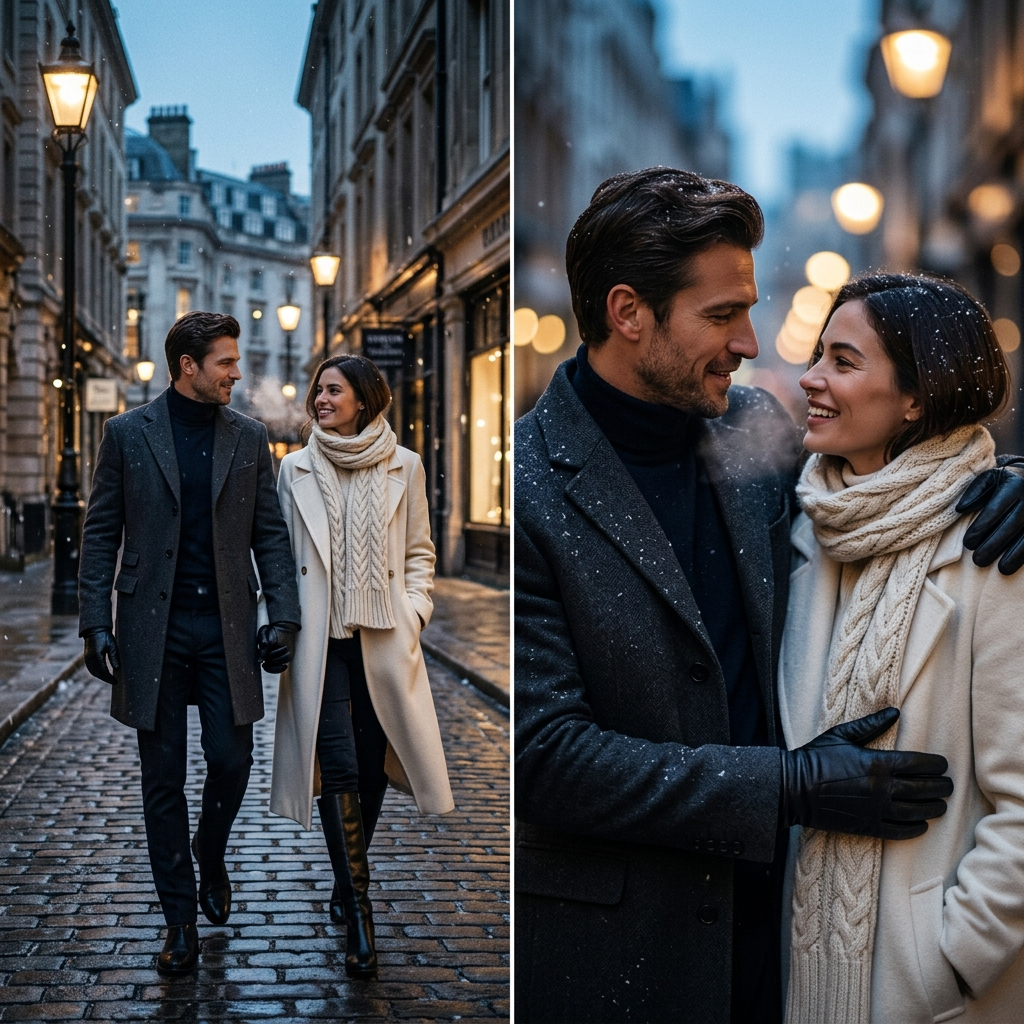 Используйте загруженные эталонные фотографии женщины и мужчины, сохраните их подлинную индивидуальность и романтическую химию. Создайте кинематографическую зимнюю городскую фотосессию для пары с роскошным стилем. Холодный синий вечерний свет, легкий снегопад, светящиеся уличные фонари, видимое дыхание в воздухе, изысканный городской фон. Он одет в угольно-черное шерстяное пальто и кожаные перчатки, она — в длинное пальто цвета слоновой кости с фактурным шарфом и дорогими сапогами. Эмоциональный, но стильный язык тела, ощущение одного крупного плана и одного общего плана, элегантное движение, зимнее редакционное настроение, реализм высокой моды, многослойность, отсутствие милых клише, отсутствие минималистичных пустых сцен — все это делает фото драматичным, модным и кинематографичным.
