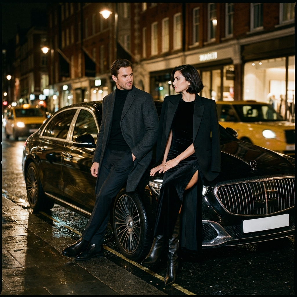 Используйте загруженные эталонные фотографии и сохраните реалистичный облик обоих людей. Создайте роскошную фотосессию для пары в стиле фэшн, снятую ночью на черном автомобиле премиум-класса, вдохновленную кинематографической рекламой модной одежды. Мокрый асфальт, мрачные отражения, глубокие тени, насыщенные блики на металле и коже. Он прислоняется к машине в темном пальто, она сидит на капоте в эффектном дизайнерском образе с острыми ботинками и длинным силуэтом. Уверенная химия, атмосфера дорогой ночной жизни, глянцевая редакционная отделка, сильная композиция, чувственная динамика, драматическая вспышка и окружающее городское сияние, никакого дешевого гламура, никакого пустого минималистичного кадра — все это создает впечатление рекламной кампании люксового бренда.