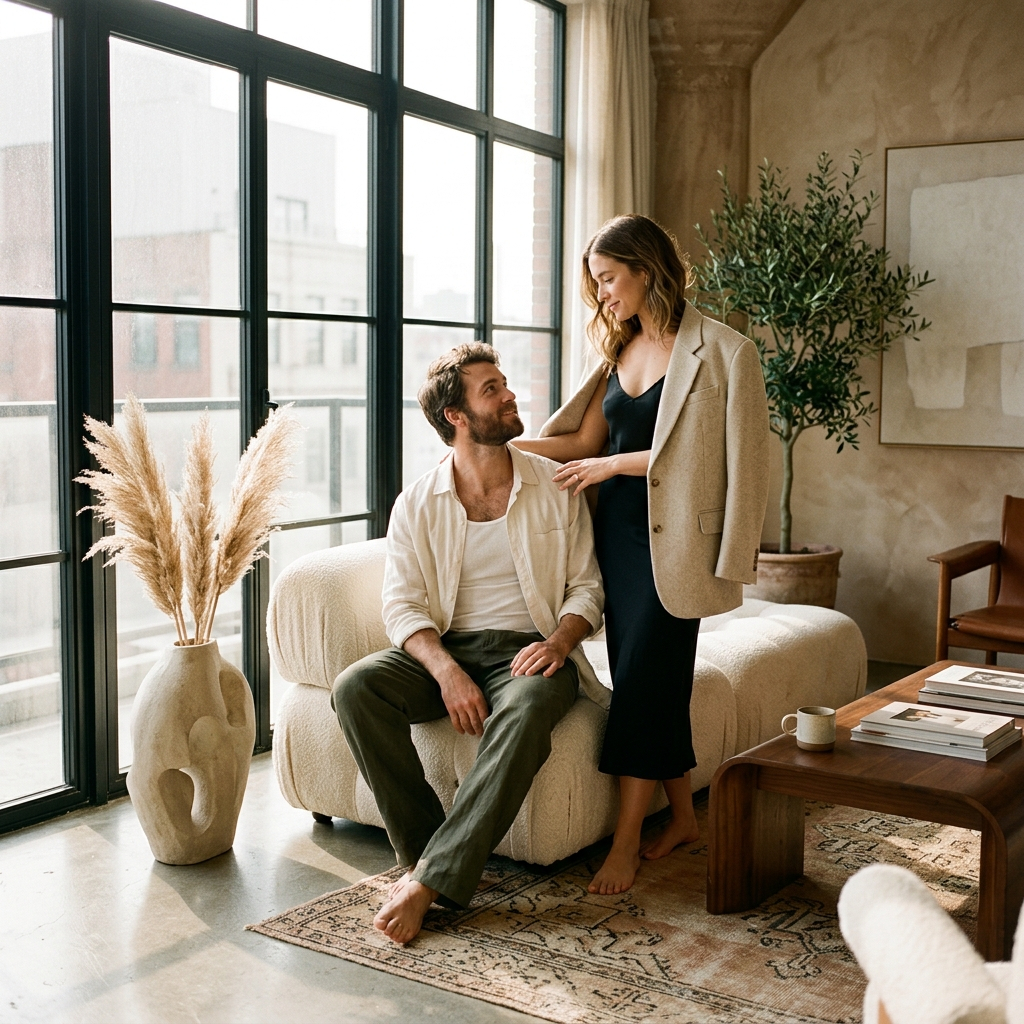 Используйте загруженные эталонные фотографии пары, сохраняя их лица естественными и узнаваемыми. Создайте изысканную фотосессию для пары в залитой солнцем дизайнерской квартире с теплым утренним светом, льняными текстурами, скульптурной мебелью и спокойной роскошной атмосферой. Он одет в свободные брюки премиум-класса и расстегнутую рубашку, она — в шелковое платье-комбинацию, надетое поверх объемного пиджака. Расслабленные, но фотогеничные позы, интимный редакционный стиль, мягкие движения, реалистичная текстура кожи, элегантная чувственность, роскошная домашняя обстановка, фотография с естественным освещением журнального уровня, богатая детализация тканей и интерьера, не минималистичный, не скучный лайфстайл-контент — все это создает ощущение интимности, современности и дороговизны.