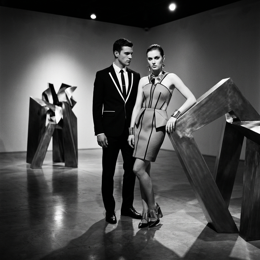 Используйте загруженные эталонные фотографии, сохраняя индивидуальность обоих участников. Создайте монохромную фотосессию для пары в современной художественной галерее со скульптурными инсталляциями и эффектным архитектурным освещением. Он одет в строгий черно-белый костюм, она – в структурированное монохромное модное платье с геометрическими аксессуарами. Высококонтрастное освещение, чистая, но сложная композиция, выразительные позы, четкие линии тела, серьезное редакционное настроение, отражения в галерее, ощущение рекламной кампании недели моды, премиальная детализация фотографии, художественное напряжение, отсутствие мягкой, шаблонной романтики, отсутствие простого минималистичного кадра – все это создаст изысканный, современный и незабываемый образ.
