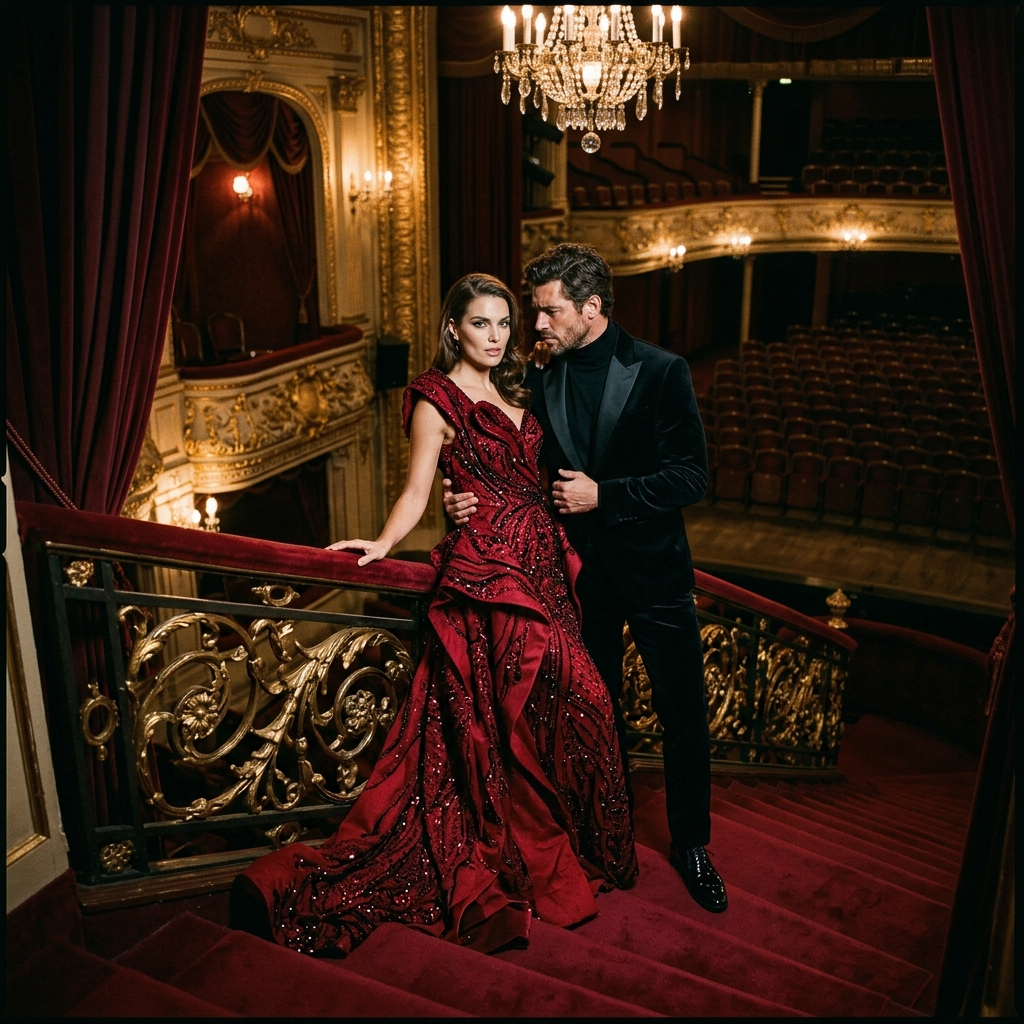 Используйте загруженные эталонные фотографии мужчины и женщины, сохраните их индивидуальность, естественную красоту и модную химию. Создайте театральную фотосессию в стиле высокой моды для пары в старинном театре с красным бархатом, драматическим освещением, насыщенными тенями, золотыми деталями и кинематографической атмосферой. Он одет в черный бархатный костюм с легким блеском, она — в эффектное платье от кутюр глубокого рубинового или черного цвета с массивными украшениями. Мощные позы, сильный зрительный контакт, роскошная атмосфера, захватывающий сюжет, многослойная композиция с театральными занавесами и балконами, глянцевое журнальное качество, дорогие текстуры, драматичность и соблазнительность, но со вкусом, никакого минимализма, никаких статичных скучных поз — сделайте это роскошно и визуально незабываемо.