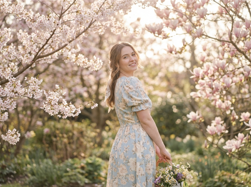Молодая женщина в весеннем платье стоит в саду с цветущими деревьями, естественное освещение, портретная съёмка, мягкий фокус, пастельные тона, высокая детализация, 4K