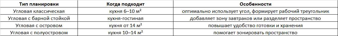 Угловые кухни подходят для большинства квартир, но компоновка зависит от размеров помещения и расположения техники.