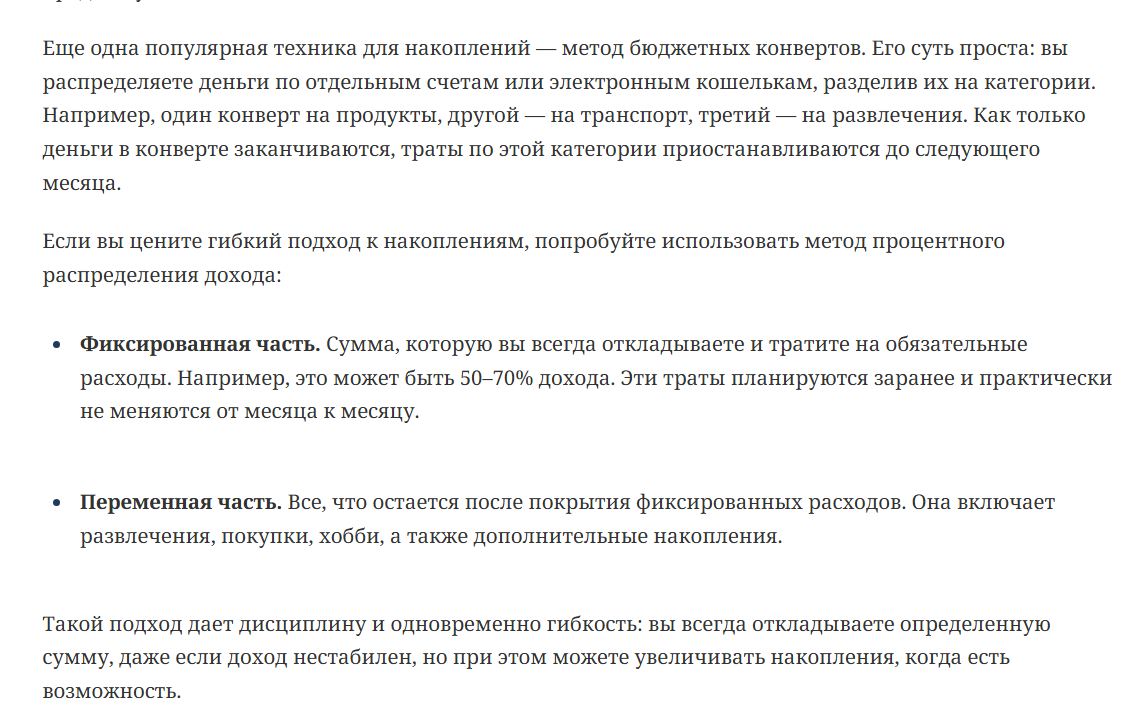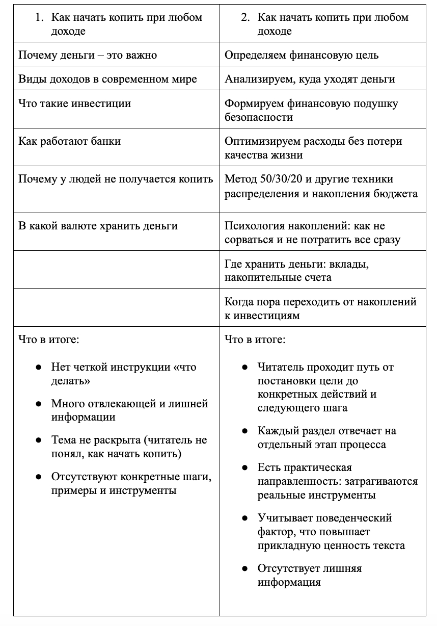 По поводу полного раскрытия темы рассмотрим два подхода к тексту «Как начать копить при любом доходе». Первую структуру в таблице, мы взяли из реальной статьи, размещенной в Рунете, второй вариант — работа нашего автора.