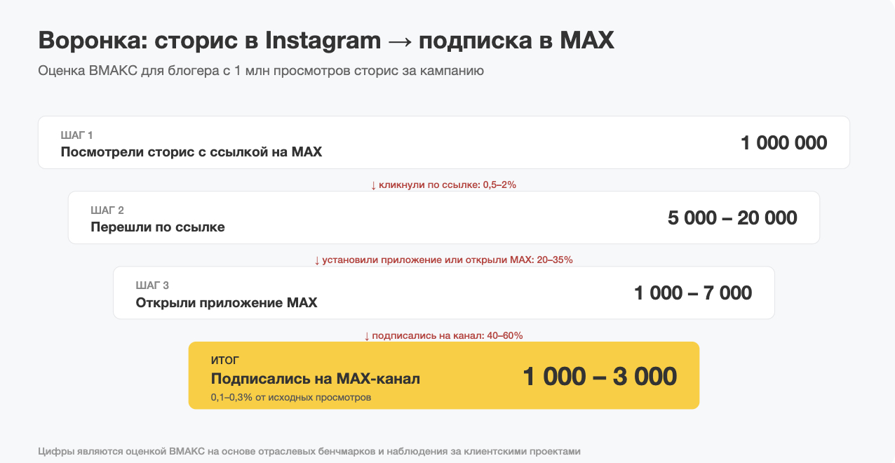 Минусы видны быстро. По нашим оценкам, конверсия «просмотр сторис → подписка на MAX-канал» составляет 0,1–0,3%. Это означает: блогер с 500 тыс. просмотров сторис получает 500–1500 подписок в MAX с одной кампании-перегона.