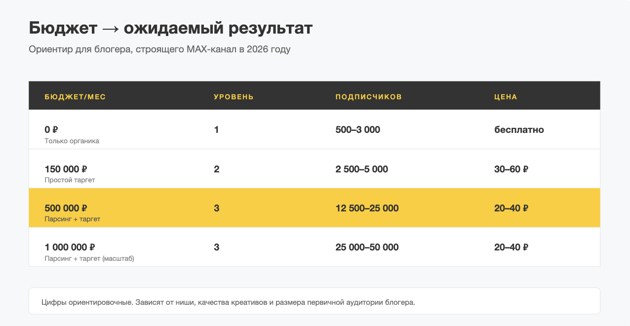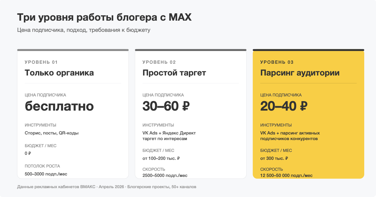 Но механики перегона очень разные по эффективности. Разберём три уровня работы блогера с MAX — и цифры каждого.