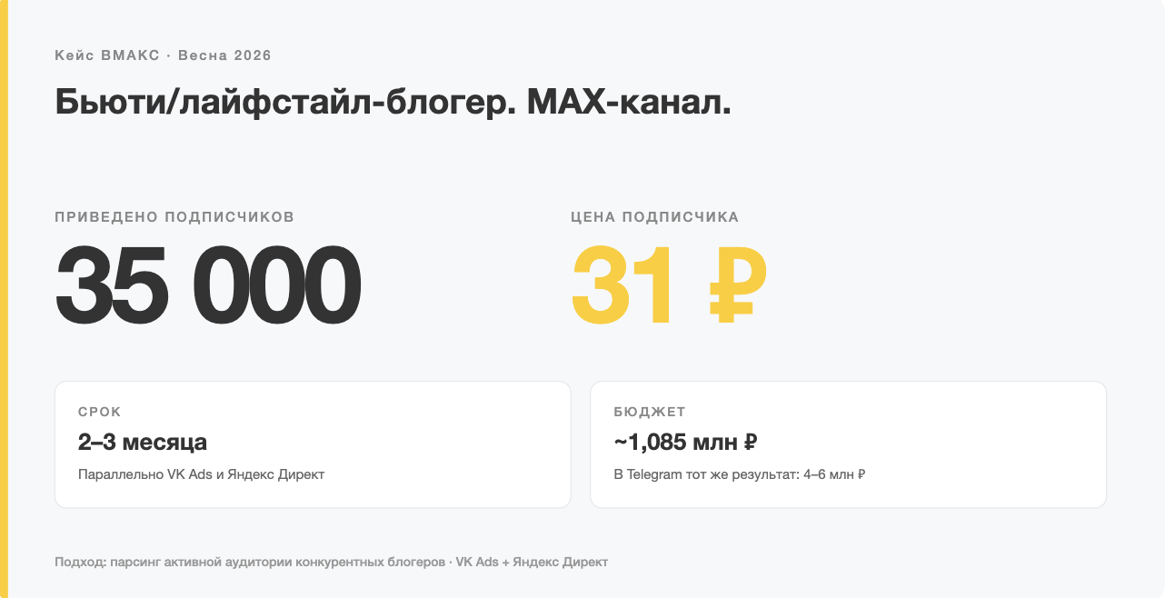Работали комплексно: парсинг активной аудитории конкурентных блогеров той же ниши, таргет VK Ads, параллельно Яндекс Директ. За 2–3 месяца привлекли 35 000 подписчиков в MAX-канал при средней цене 31 ₽ за подписчика. Общий рекламный бюджет — около 1,085 млн ₽.