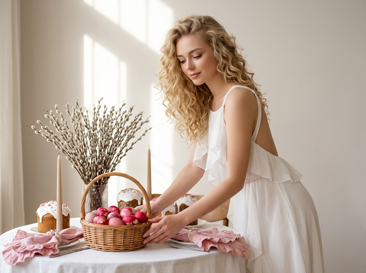 Портрет девушки, сохранить внешность и цвет волос, белое платье с открытой спиной и шифоновыми бретелями, распущенные локоны, профессиональный макияж, стоит у пасхального стола (скатерть, куличи, розовые яйца, корзина, верба, свечи), мягкий дневной свет, спокойная улыбка, взгляд на руки, фотореализм, студийный свет, высокая детализация, 85mm, малая глубина резкости