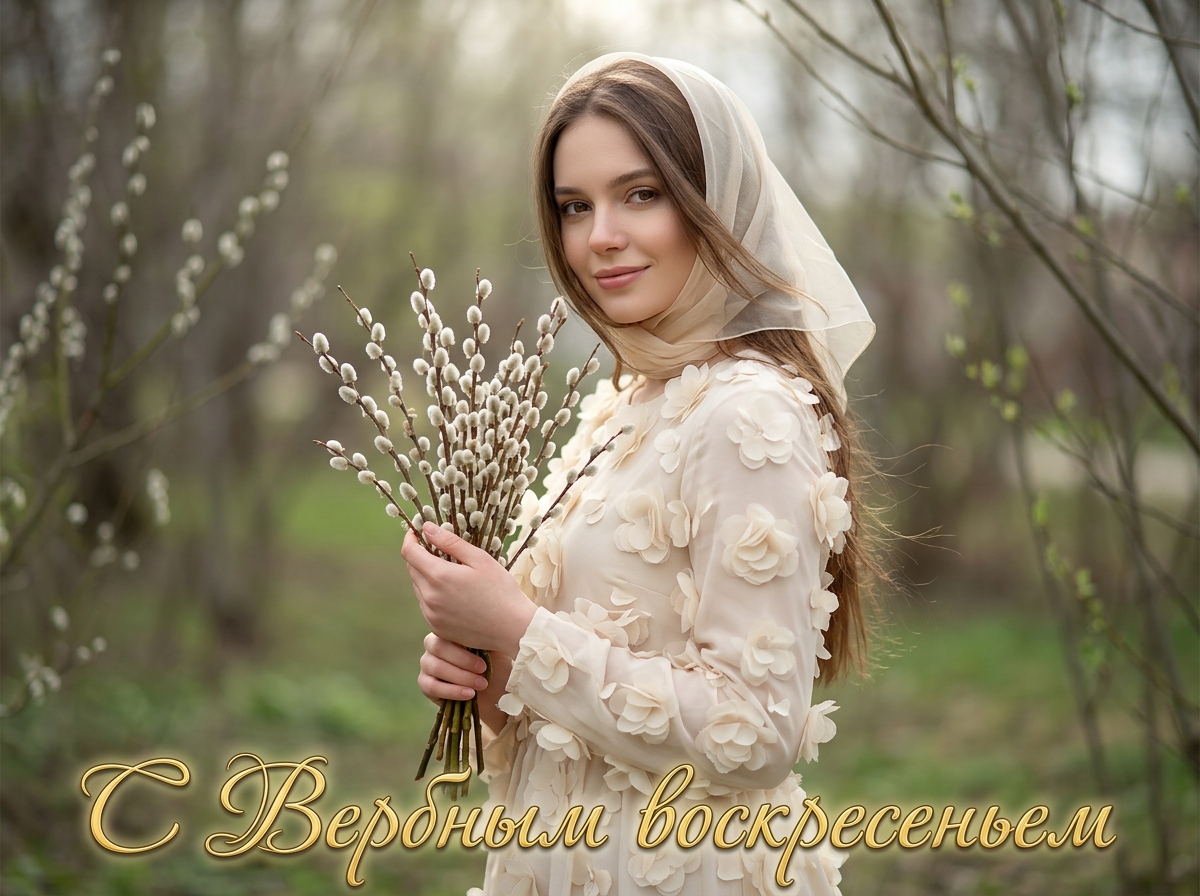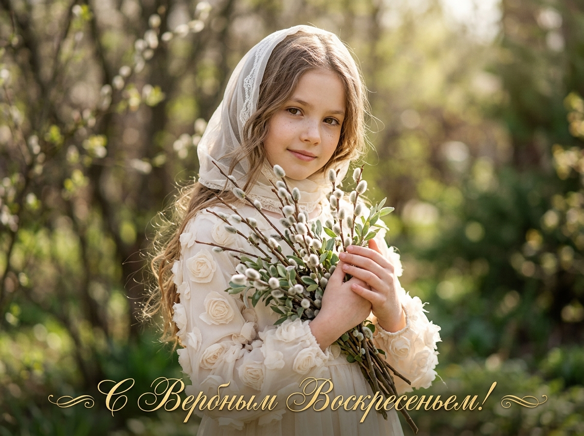 Девочка с длинными волосами, светлое платье с тканевыми цветами, полупрозрачный платок, держит веточки вербы, полу профиль, мягкая улыбка, взгляд в камеру, утренний мягкий свет, размытый фон природы, фотореализм, высокая детализация, 9:16, надпись «С Вербным Воскресеньем» золотым шрифтом