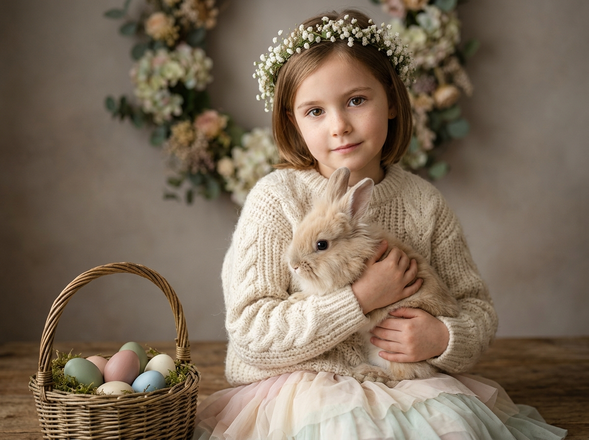 Девочка в кремовом свитере и лёгкой юбке, венок из белых цветов, держит пушистого бежевого кролика, рядом корзина с пастельными яйцами, мягкий свет слева, нейтральный фон, уютная атмосфера, фотореализм, высокая детализация, 9:16