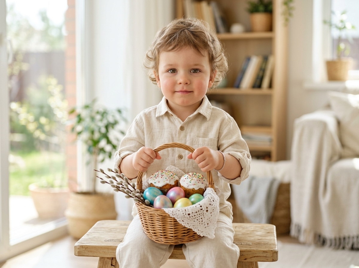 Мальчик 1 год, льняная рубашка и штаны молочного цвета, держит плетёную корзину (яйца, кулич, верба), мягкий свет, светлая комната, спокойная улыбка, взгляд в камеру, фотореализм, 85mm, малая глубина резкости, 8K, 9:16