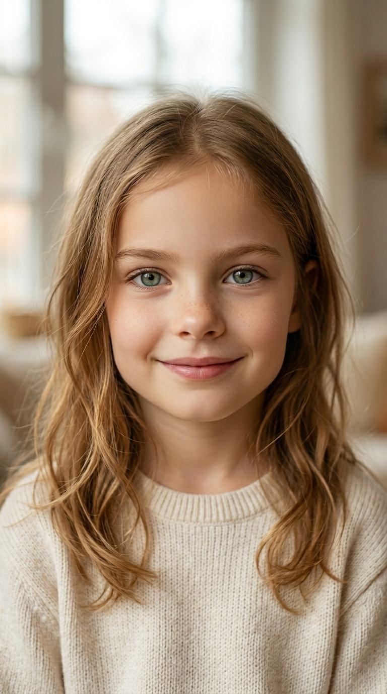Используй изображение девочки как референс. Создай взрослую версию дочери этой пары. Сохрани черты лица ребёнка, учитывай генетическую наследственность родителей. Реалистичная взрослая женщина, натуральные пропорции лица, фотореализм, естественный свет, реалистичная фотография высокого качества.