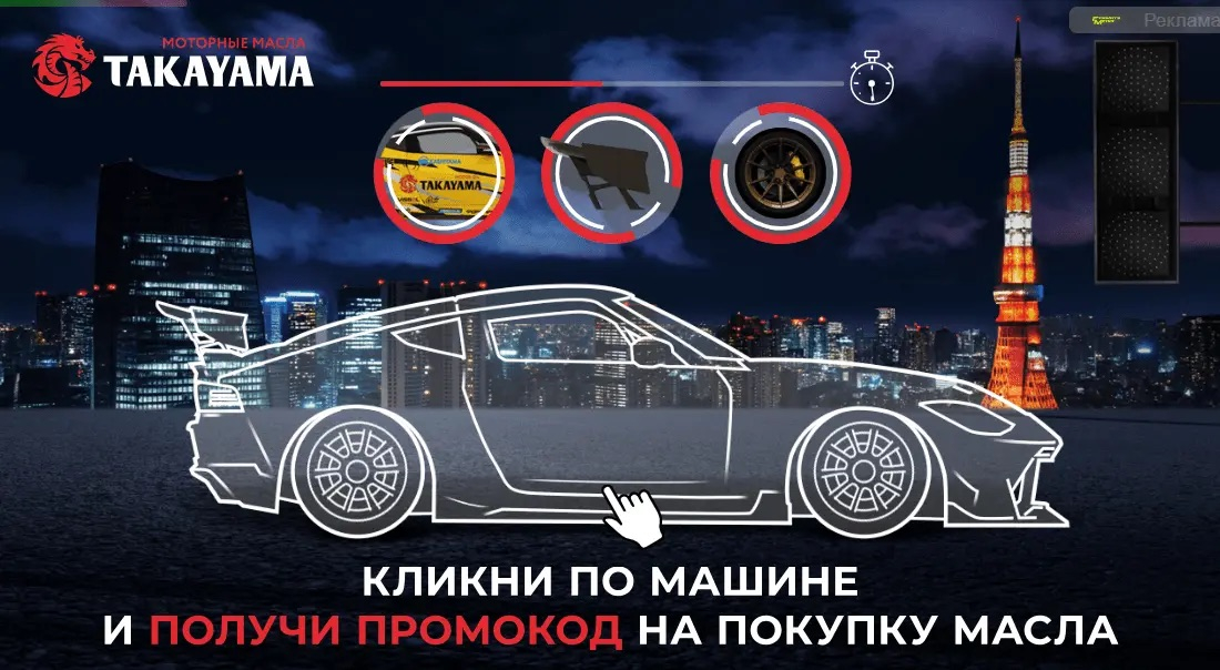 Бренд активно использует образ лидера команды и его машины в различных медийных кампаниях в диджитал пространстве. Геймификация в рекламном контенте Takayama выполняет роль «моста» между вовлечением и конверсией: интерактивные rich-баннеры и видео-контент тестируются с разной глубиной игры. Можно посмотреть короткое интерактивное видео или поиграть в мини-игру и в конце получить промокод или сразу перейти к покупке на маркетплейсе.