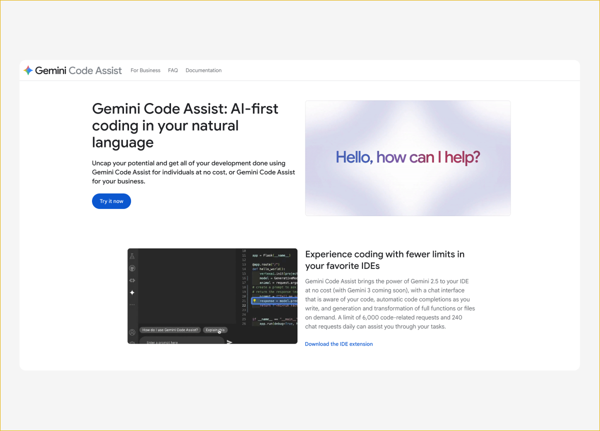 Ассистент работает в VS Code, JetBrains IDE, Android Studio и Google Cloud Shell. Он умеет дописывать код, объяснять незнакомые куски, генерировать тесты, дебажить и переводить код между языками. Контекстное окно — 1 миллион токенов, поэтому Gemini Code Assist может держать в голове большие проекты целиком.
