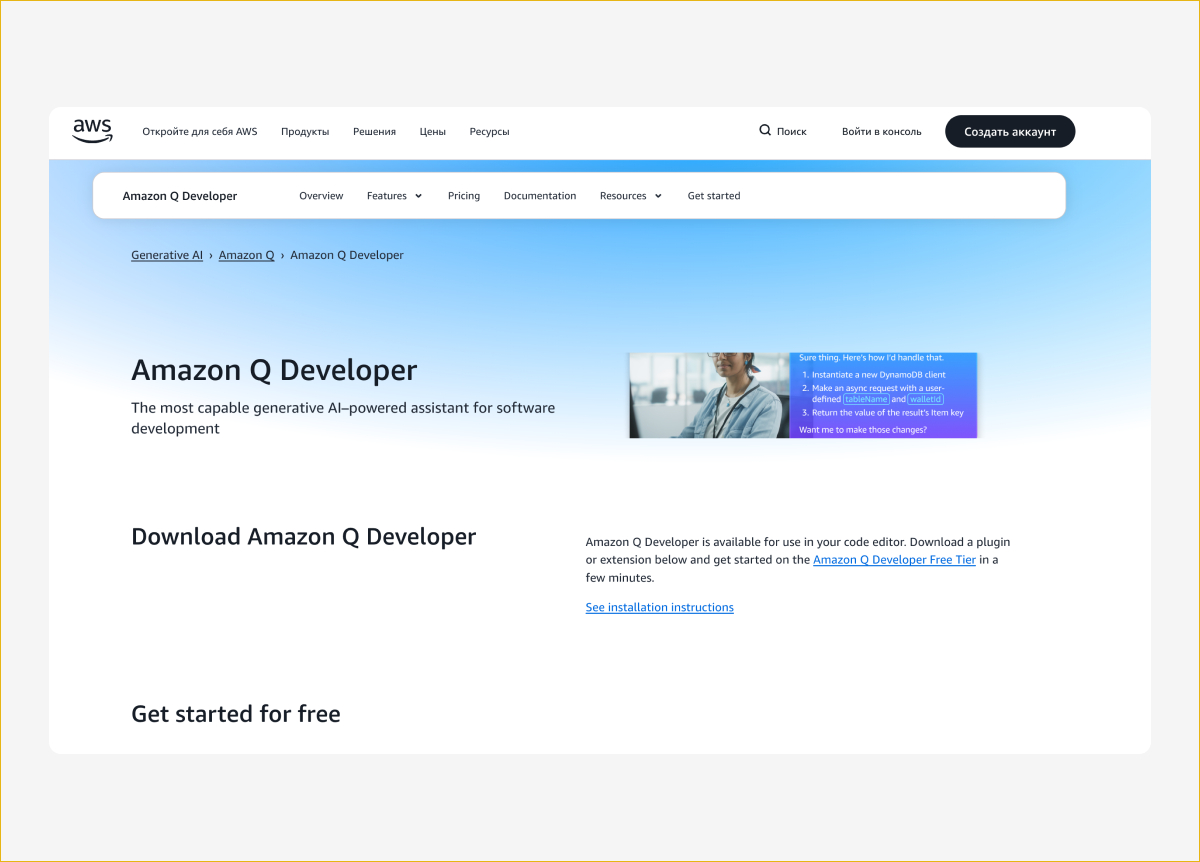 Amazon Q Developer — ИИ-ассистент от Amazon, наследник CodeWhisperer. Его главное преимущество — глубокая интеграция с AWS. Q знает все сервисы Amazon, помогает писать инфраструктуру как код, отлаживать ошибки в консоли и переводить старые проекты на новые версии языков.