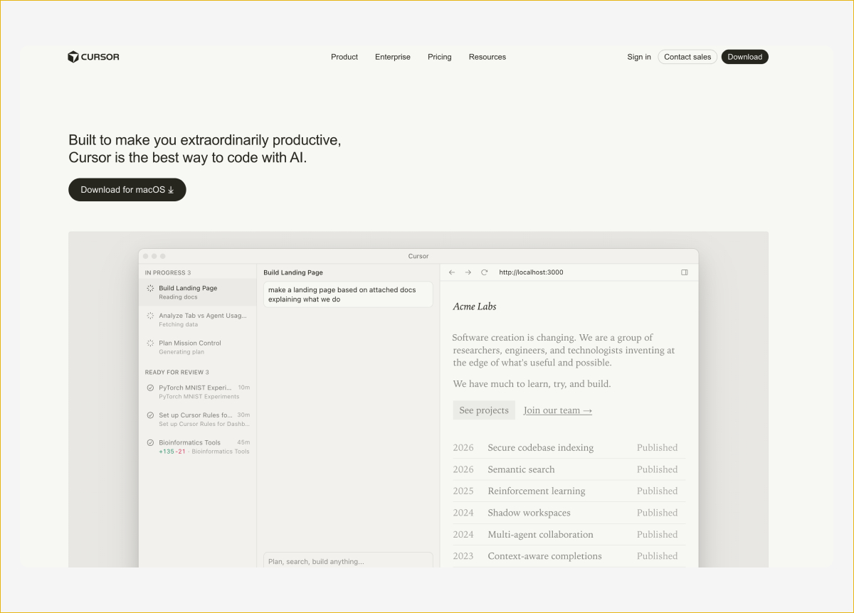 Cursor — это редактор кода от компании Anysphere, который построен с нуля вокруг ИИ. Технически это форк VS Code, поэтому переход для разработчиков почти безболезненный: те же горячие клавиши, расширения и темы. Но дальше начинаются отличия. Cursor индексирует весь проект и понимает связи между файлами, поэтому подсказки и правки получаются гораздо точнее, чем у плагинов поверх обычного редактора.