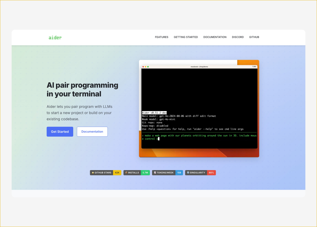 Aider — open-source инструмент для работы с кодом в терминале. Он бесплатный, написан на Python и подключается к любой популярной модели: Claude, GPT, Gemini, DeepSeek или локальным моделям через Ollama. Вы платите только за токены провайдера, а сам инструмент не стоит ничего. Aider строит карту проекта, чтобы ИИ понимал структуру кодовой базы целиком, а не работал с одним файлом.