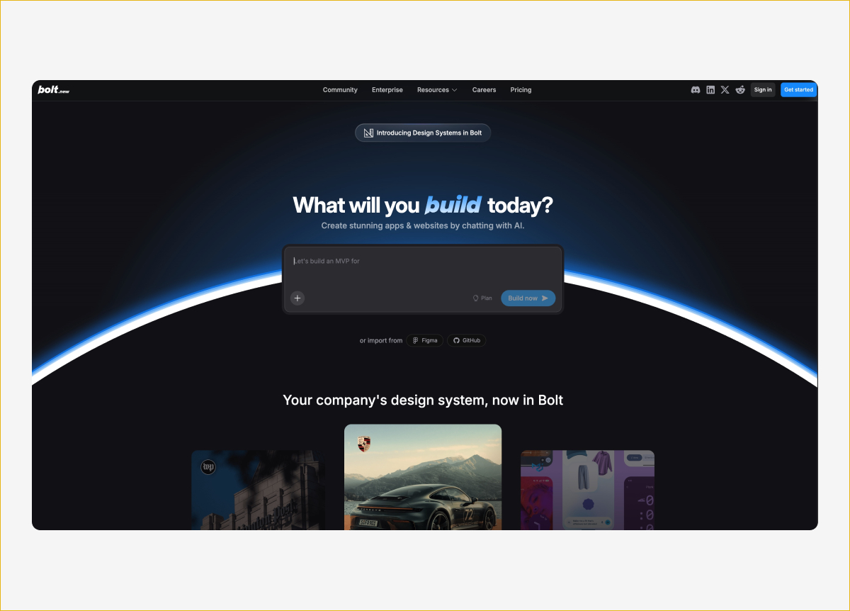 Bolt задуман для быстрых прототипов и MVP. Описываете идею простым языком: «лендинг для SaaS с формой подписки и блогом» или «дашборд для отслеживания личных финансов на FastAPI» — и Bolt пишет код, ставит зависимости, запускает приложение и показывает результат в превью прямо в браузере. Дальше можно править готовый код вручную или дальше общаться с агентом.