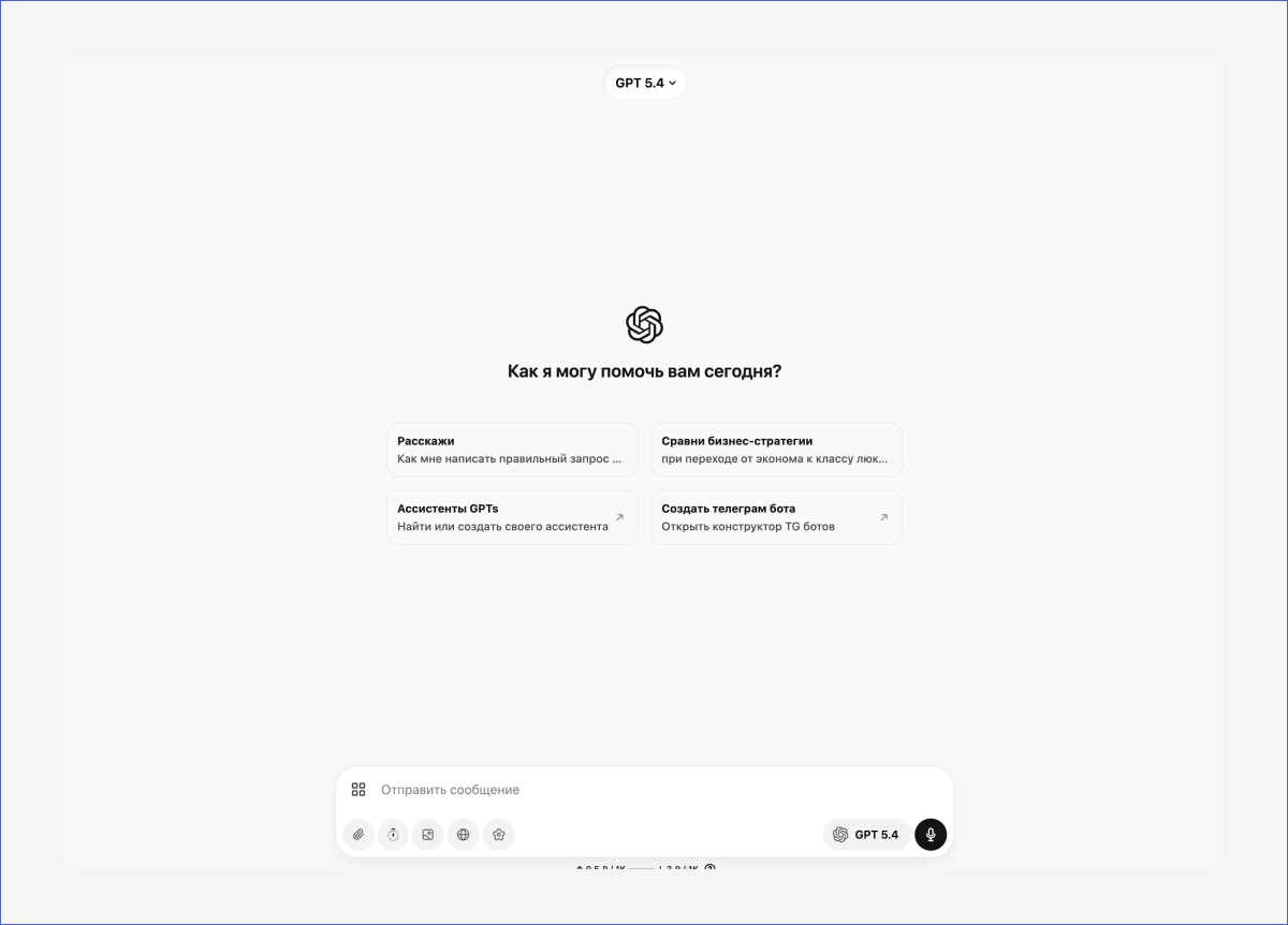Что делает: генерирует код, запускает его в чате, создаёт изображения, анализирует файлы, ищет в интернете.