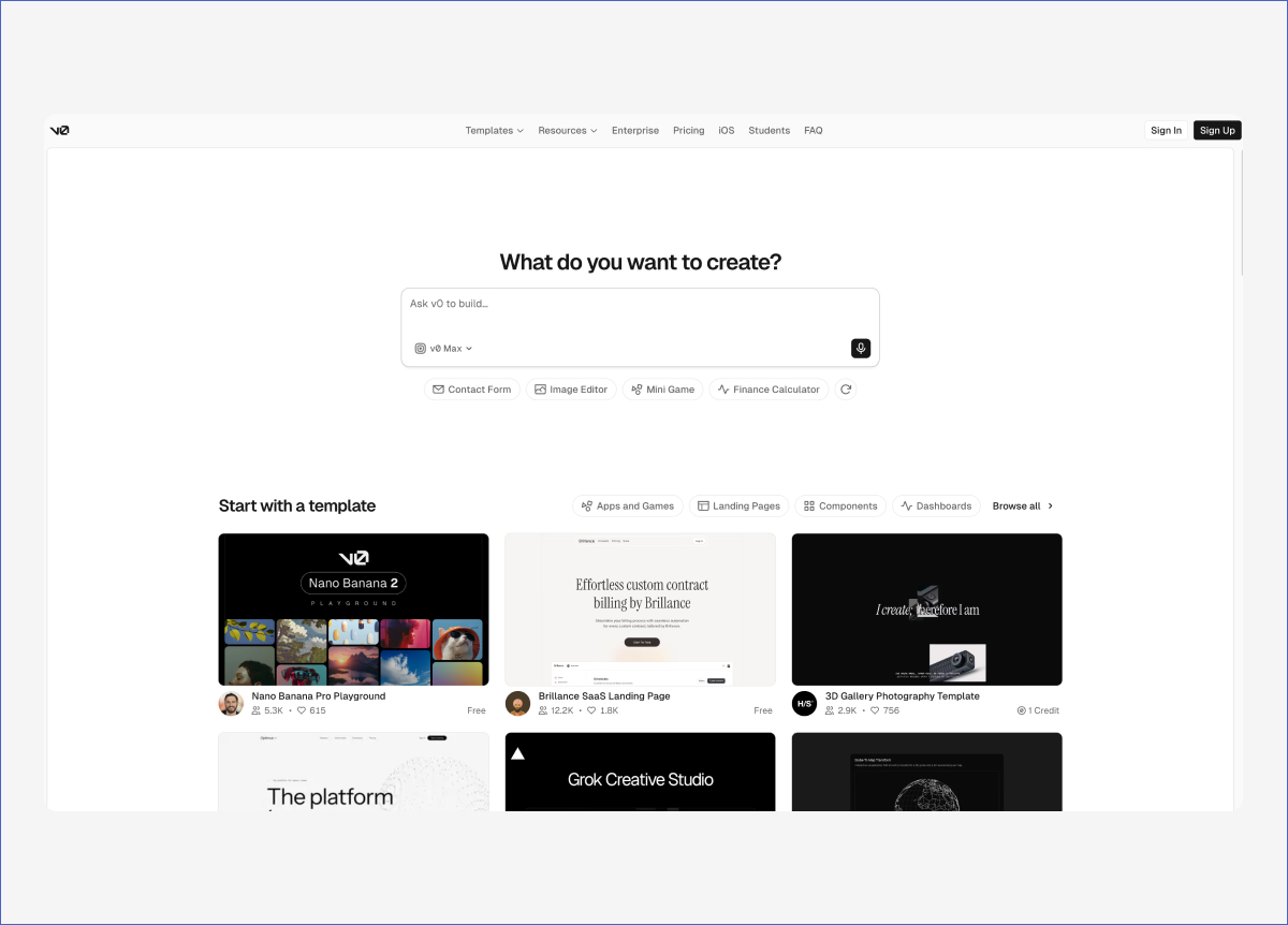 Сервис от Vercel — компании, которая делает Next.js, один из самых популярных фреймворков для веб-разработки. Изначально v0 был генератором отдельных UI-компонентов, но к 2026 году вырос в полноценный фуллстек-инструмент.