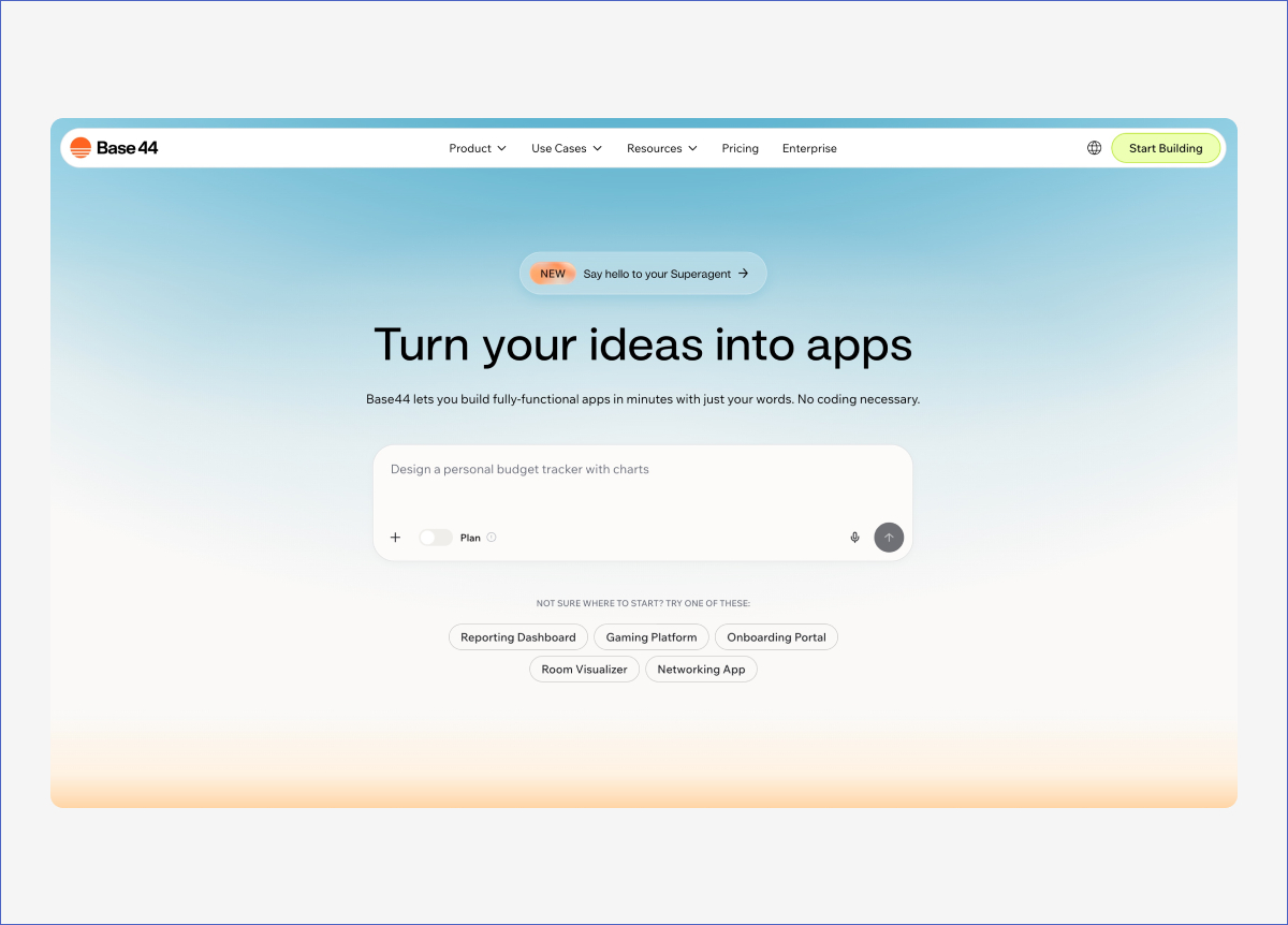 Самый дружелюбный к новичкам сервис из категории. Если Lovable требует понимания, что такое промпт и как с ним работать, Base44 ведёт за руку: есть инструмент планирования, который позволяет сначала спроектировать приложение в режиме обсуждения и только потом запустить генерацию.