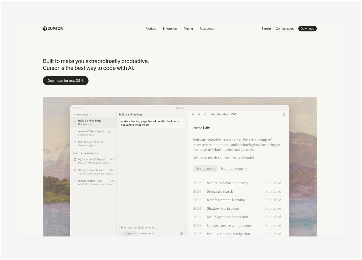 Самый популярный ИИ-редактор кода в 2026 году. Cursor — это форк Visual Studio Code, в который ИИ встроен на уровне архитектуры, а не прикручен сверху как плагин. По интерфейсу выглядит почти как обычный VS Code, поэтому разработчики осваивают его за час.