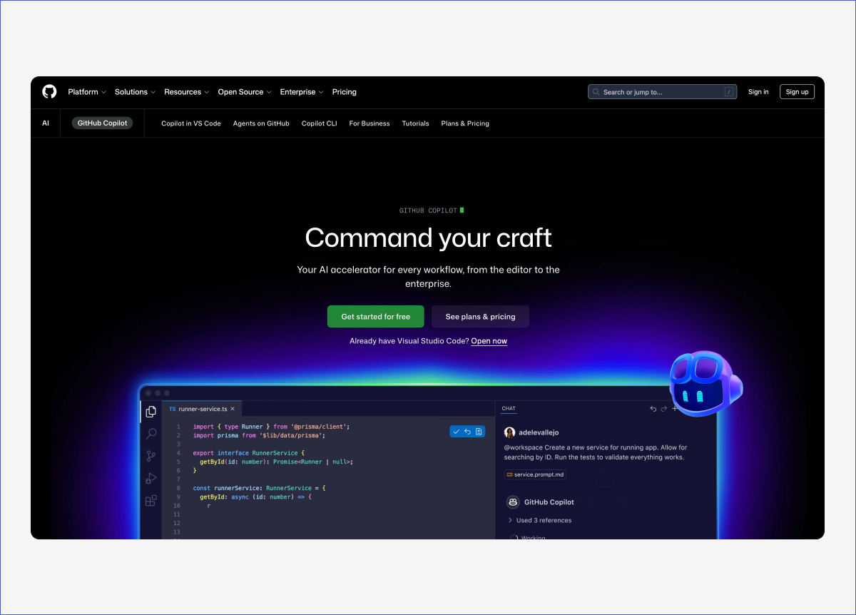 Самый дешёвый и самый распространённый ИИ-помощник для разработчиков. Copilot встраивается в любую популярную среду разработки — VS Code, JetBrains, Visual Studio, Neovim, Xcode, Eclipse — и работает там как умное автодополнение.