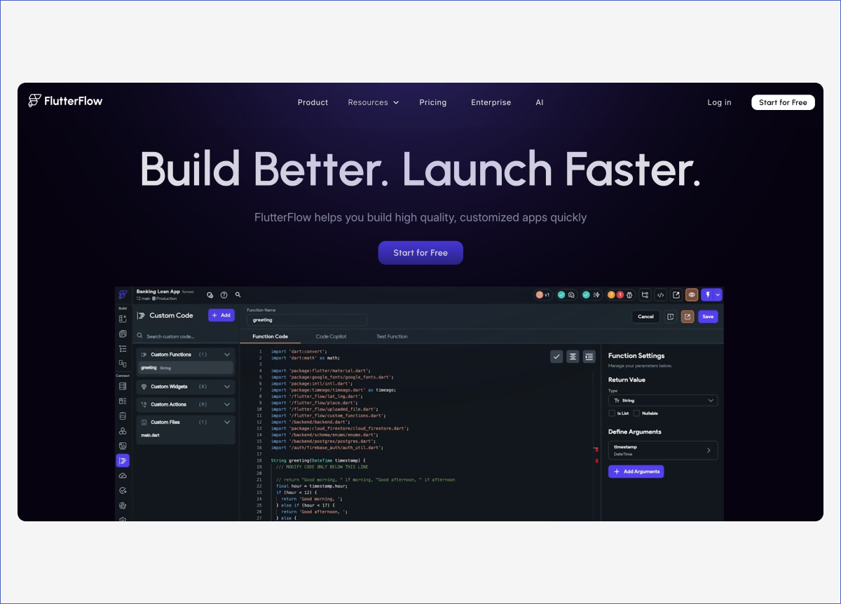 ИИ-сервис для тех, кому нужны нативные мобильные приложения для iOS и Android. FlutterFlow строится поверх Flutter — фреймворка от Google, на котором написаны приложения BMW, eBay, Google Pay и Alibaba. На выходе получается настоящее нативное приложение, которое можно опубликовать в App Store и Google Play.