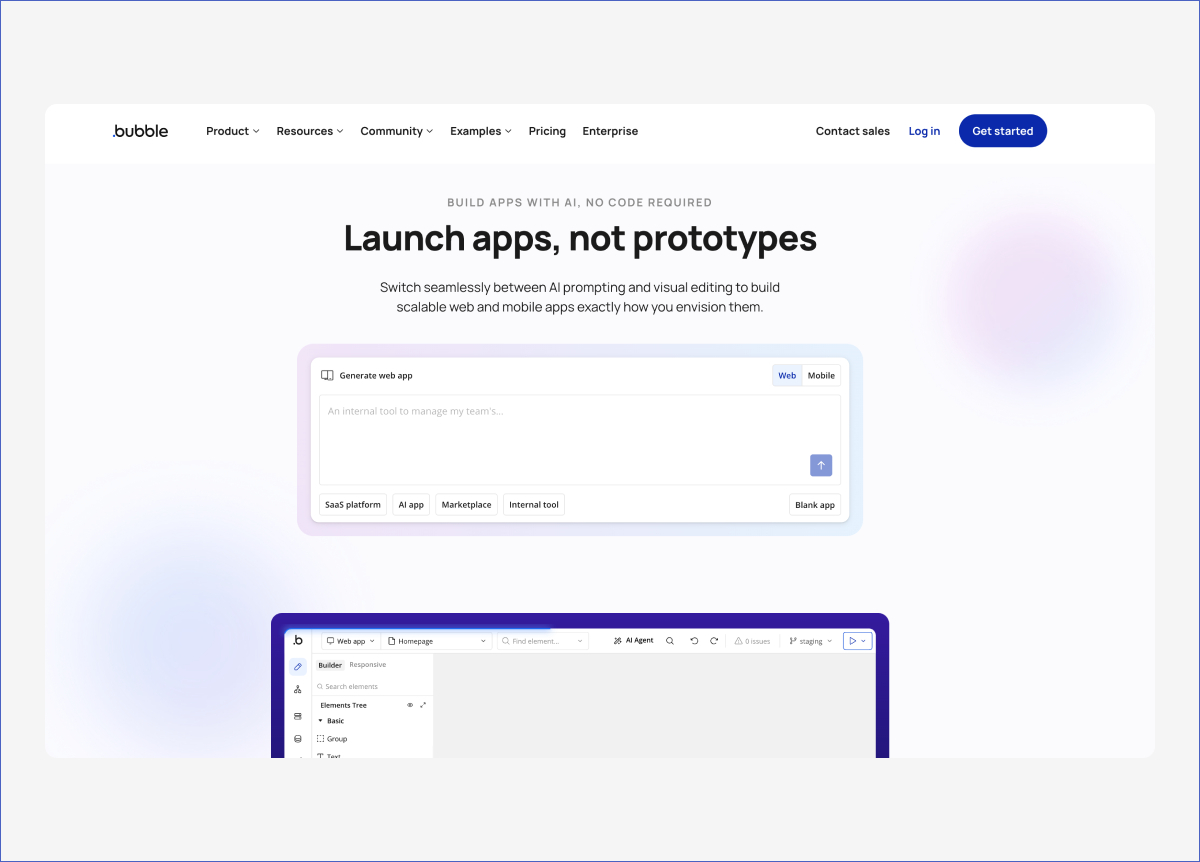 В 2024-м Bubble добавил ИИ-ассистента, который генерирует страницы по описанию, предлагает структуру базы данных и помогает настроить логику приложения.