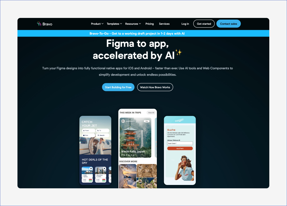 Дизайнер делает макеты с особой разметкой, Bravo читает их, добавляет логику и собирает нативное iOS/Android приложение.