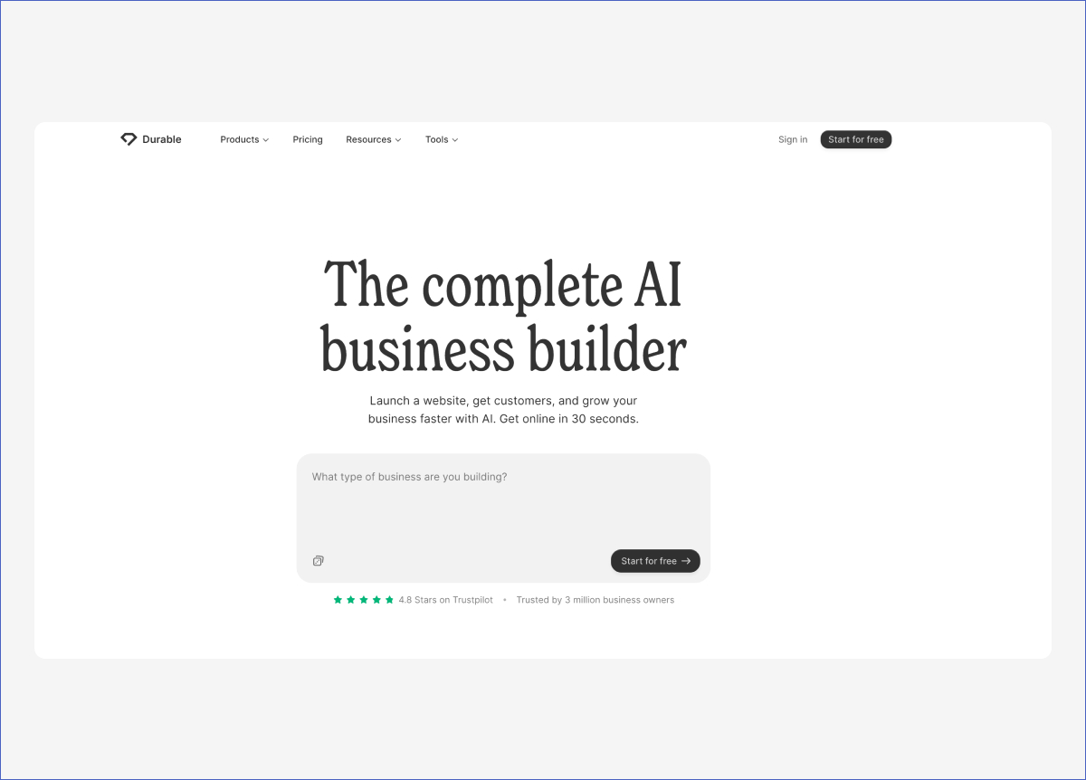 Durable — один из самых быстрых ИИ-конструкторов сайтов. Он создает готовый сайт буквально за 30–60 секунд. Подходит для тех, кому нужно быстро запустить страницу без настройки.