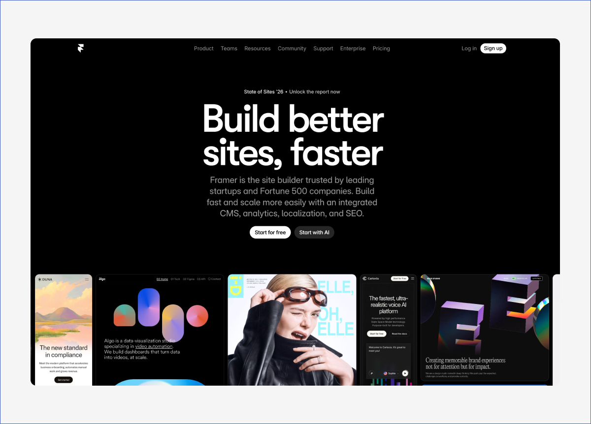 Framer — один из самых продвинутых конструкторов сайтов. В отличие от простых генераторов, он делает не просто шаблон, а аккуратный, современный дизайн, который можно использовать без серьезных правок.