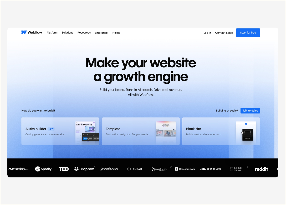 Главное преимущество — уровень контроля. Webflow используют дизайнеры и разработчики, потому что он позволяет создавать сложные и уникальные интерфейсы без прямого написания кода. При этом AI сокращает время на подготовку структуры и контента.